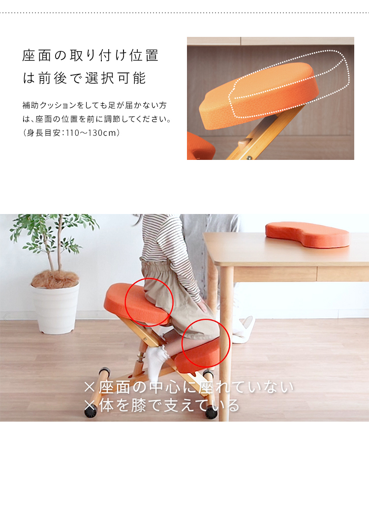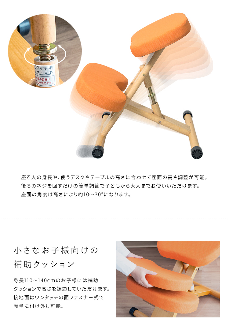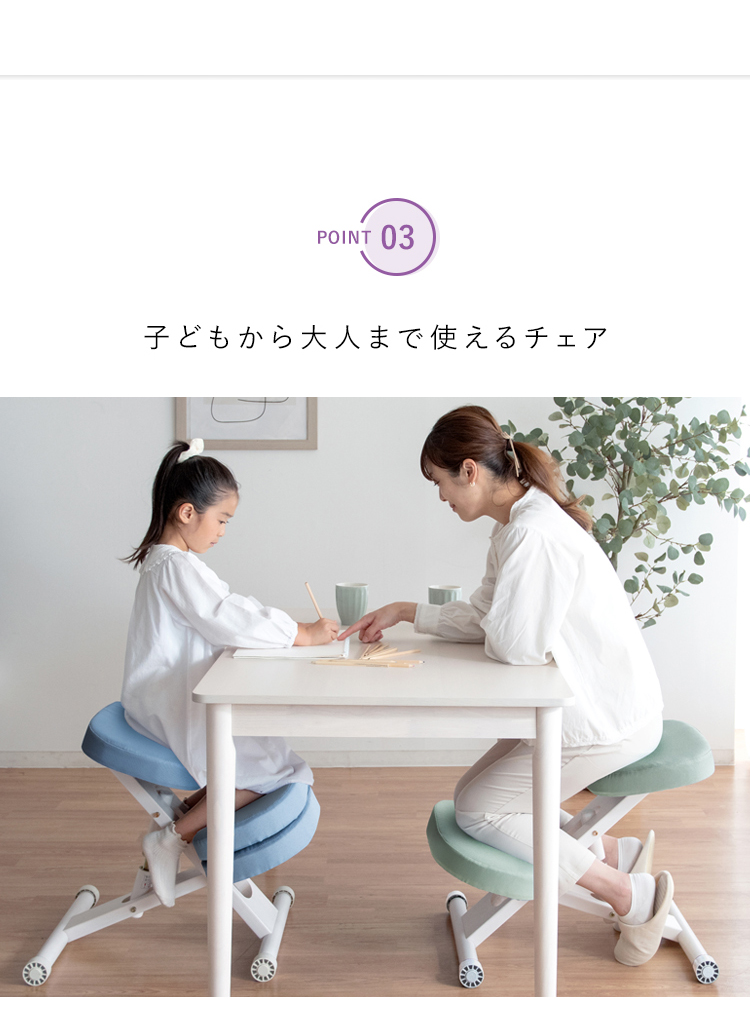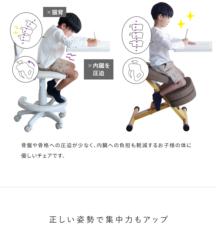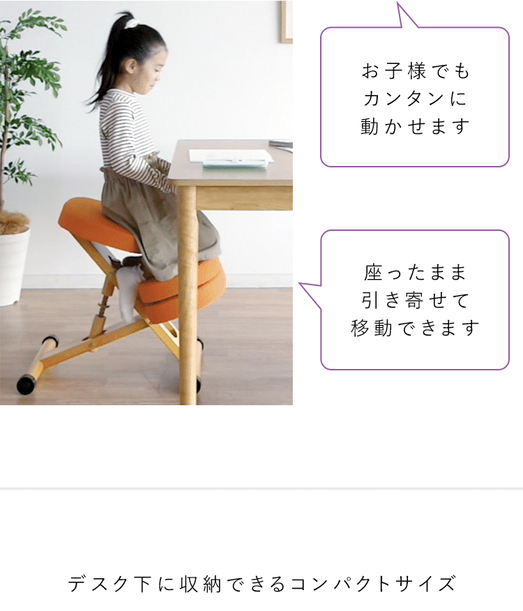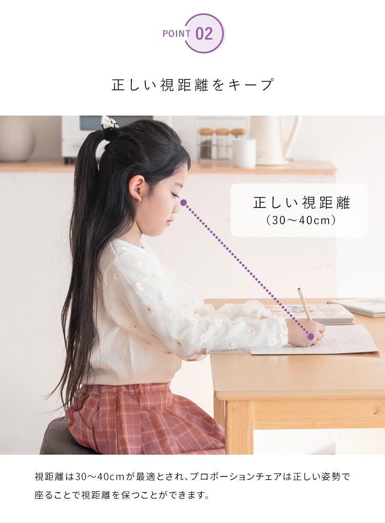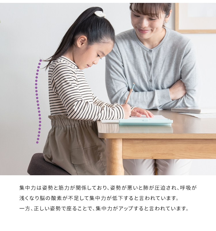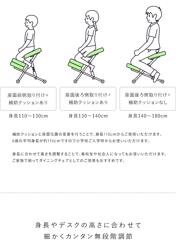 斜めの座面が立ち姿勢のように骨盤が立つので自然と背中がS字カーブを描き、理想的な姿勢を作り出せます。また、正しい姿勢で座ることで視距離を保つことができます。高さ調整と補助クッションで身長110cmのお子様からお使いいただけます。