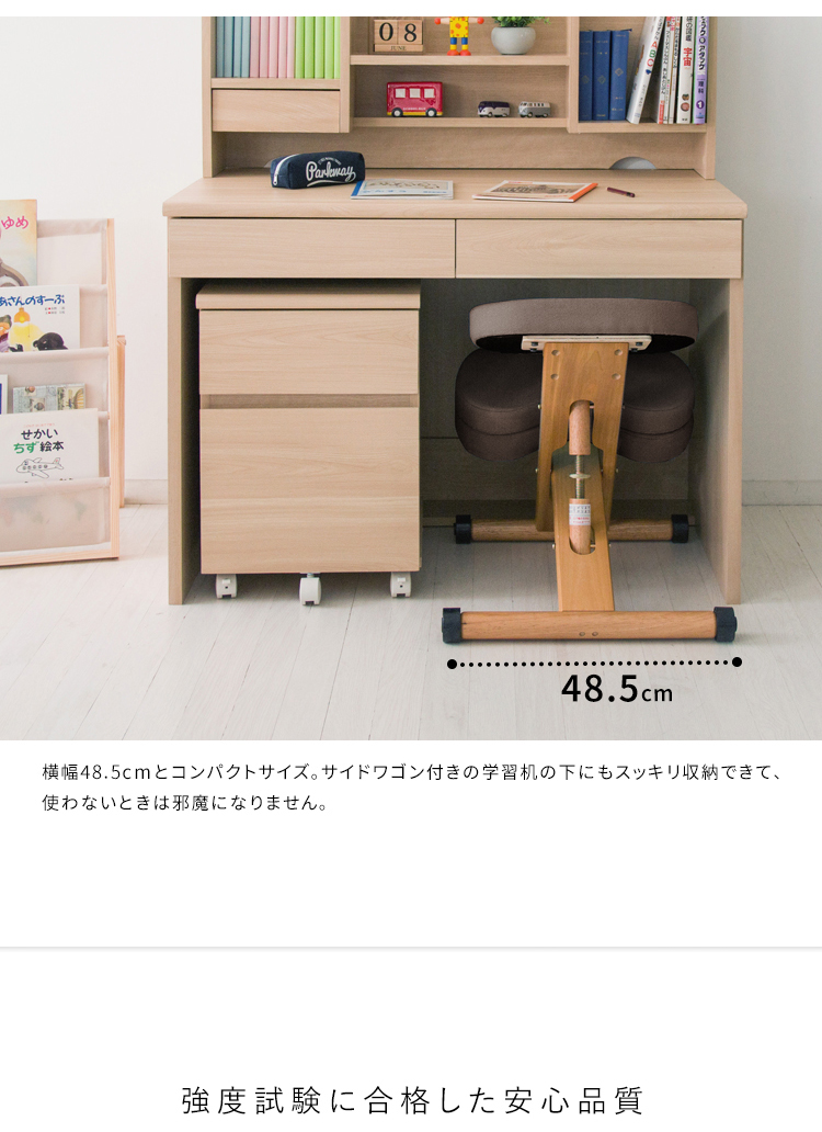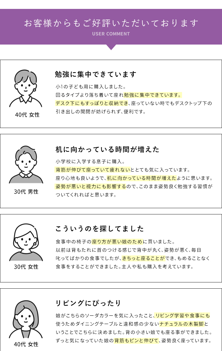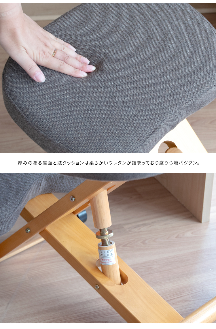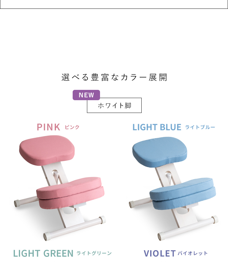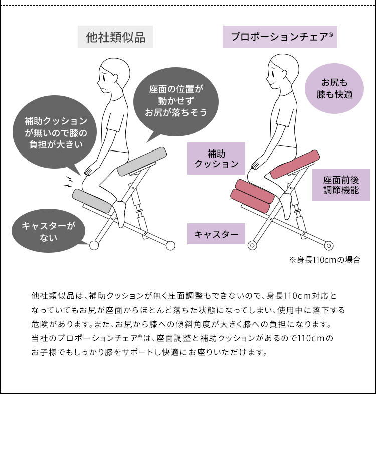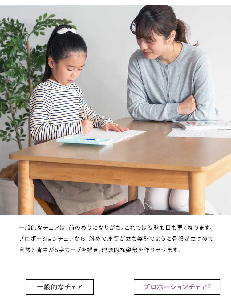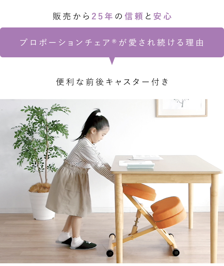 斜めの座面が立ち姿勢のように骨盤が立つので自然と背中がS字カーブを描き、理想的な姿勢を作り出せます。また、正しい姿勢で座ることで視距離を保つことができます。高さ調整と補助クッションで身長110cmのお子様からお使いいただけます。