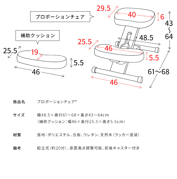 幅48.5×奥行61〜68×高さ43〜64cm(補助クッション:幅46×奥行25.5×高さ5.5cm)