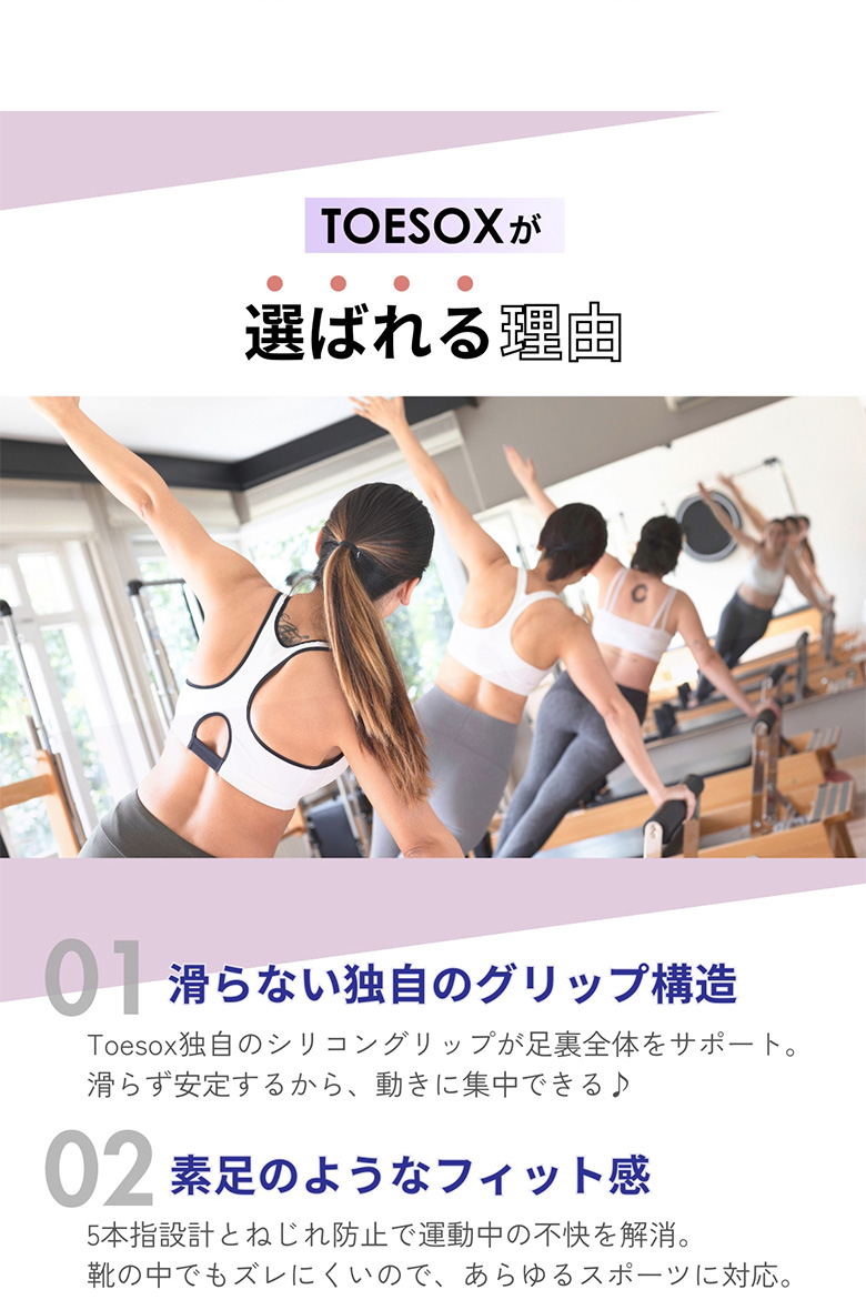 足の健康を追及し製造されたToeSoxのソックスは、フィットネスやヨガなどのインドアスポーツから普段使いまで、あらゆるシーンで愛用されています。