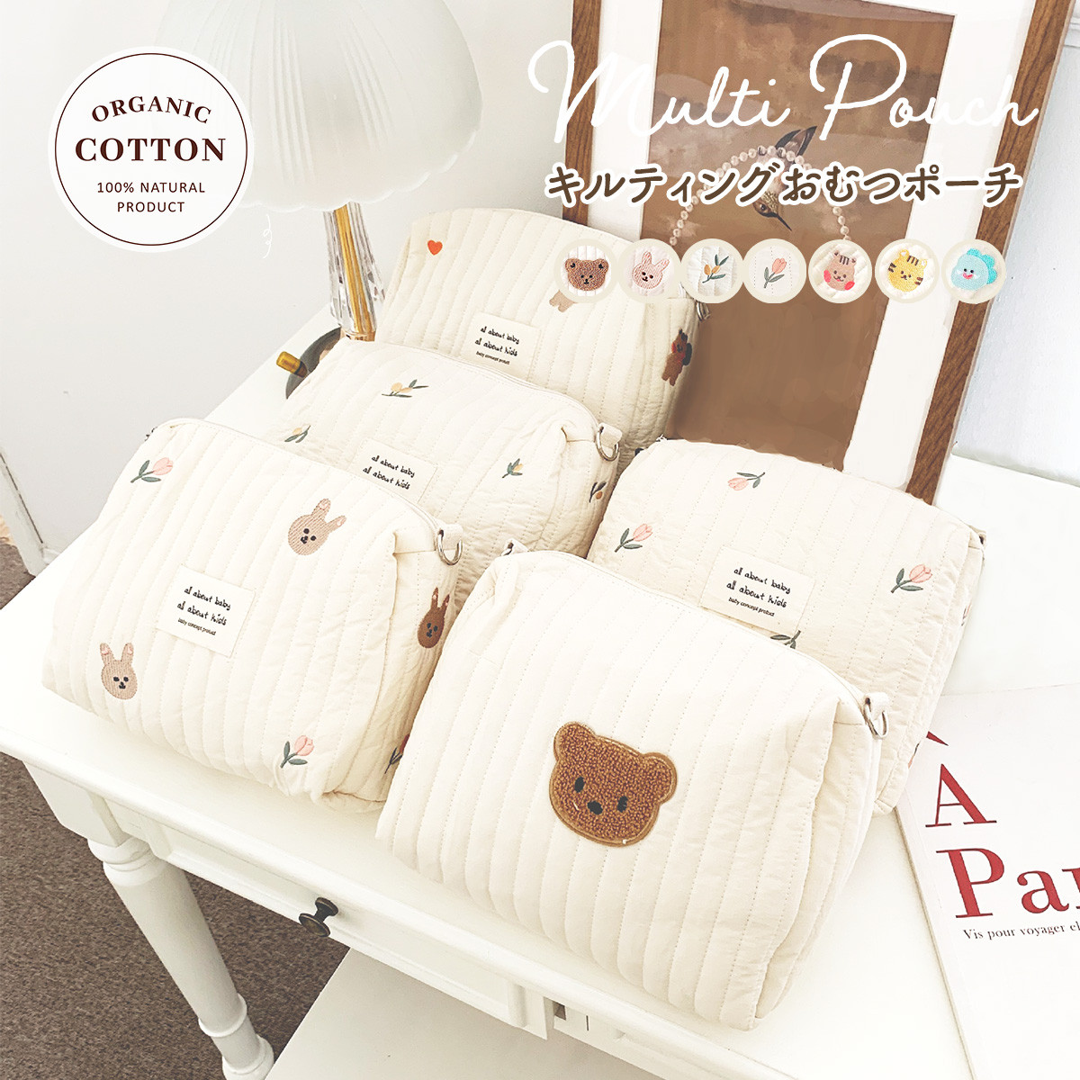 ポーチは、両サイドに紐がついたキュートなクマ柄や、片サイドに紐がついた上品な花柄やかわいい動物柄など、デザインも豊富です。
