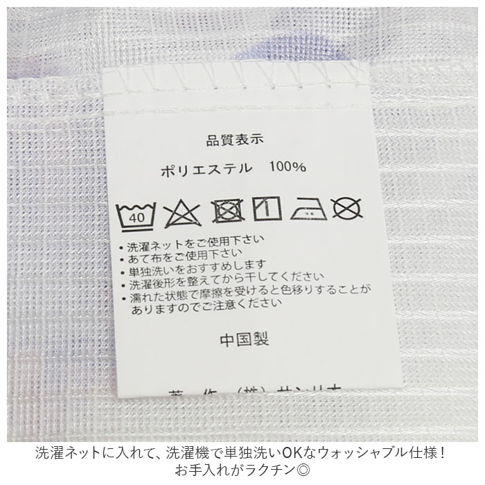 | 注意点 | ※洗濯機:可(ネット使用) ※長時間日光にあたったり、摩擦、水漏れなどによる色落ちや色移りすることがあります。 ※お取り扱いの際は、商品やパッケージなどに記載されている品質表示、アテンションタグ、ご使用上の注意事項などを必ずご確認下さい。 ※本来の目的以外にはご使用にならないで下さい。 ※カメラやモニターの性質により、画像と実物の色の違いがある場合がございますのでご理解願います。 |