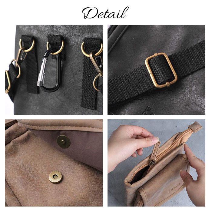 | 商品説明 | ・シンプルなデザインで飽きのこない2wayシザーケースが登場! ・必要最低限の荷物を収納でき、旅先でのサブバッグや、ちょっとしたお出かけにも便利なサイズ感が◎ ・ショルダーベルトがついているため、ショルダーバッグとしての使用も可能!どんなスタイルにもマッチ。 ・ファスナー付きのメイン収納スペースはスマホやパスポートなどの収納に。内側にもファスナーポケットがあるため、貴重品入れにしてもOK! ・前面はフラップ式のマグネットボタン仕様でラウンドファスナーポケットになっていて小物入れに最適。 ・カラーバリエーションも豊富で、様々なシーンで使用が可能。 ・高級感溢れる本革風質感のヴィンテージ調フェイクレザーがたまらなくクール!どんなファッションにも相性バツグン! |