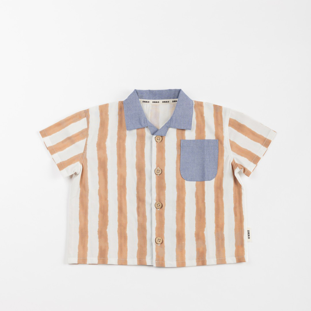 | ・ストライププリントがおしゃれなオープンシャツ ・別売りのハーフパンツとセットアップ可能 ・ボタンで全開になるので羽織りとして使用してもOK |