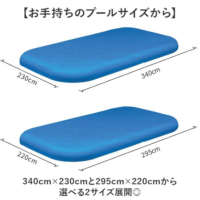 | ・【プールの水を節水できる】 ・大きなプールもすっぽりカバー!2サイズから選べるプールカバーが新発売。 ・【お手持ちのプールサイズから】 ・・340cm×230cmと295cm×220cmから選べる2サイズ展開◎ ・【すっぽりとカバー可能】 ・大きなサイズ感でプールをしっかりとゴミや落ち葉からカバーできるのがGOOD。 ・【出しっぱなしでも大丈夫】 ・耐久性のある素材なので屋外に出しっぱなしでも、カバーが壊れにくいのも嬉しいポイント。 ・【風でめくれない】 ・四隅のゴムループをプールの角にくぐらせれば、風でめくれて飛ばされない◎ ・【節水効果もアリ】 ・ゴミの侵入やプール内の水の蒸発も防ぐ効果があるので水が長持ちに。交換の手間も少なくなる |