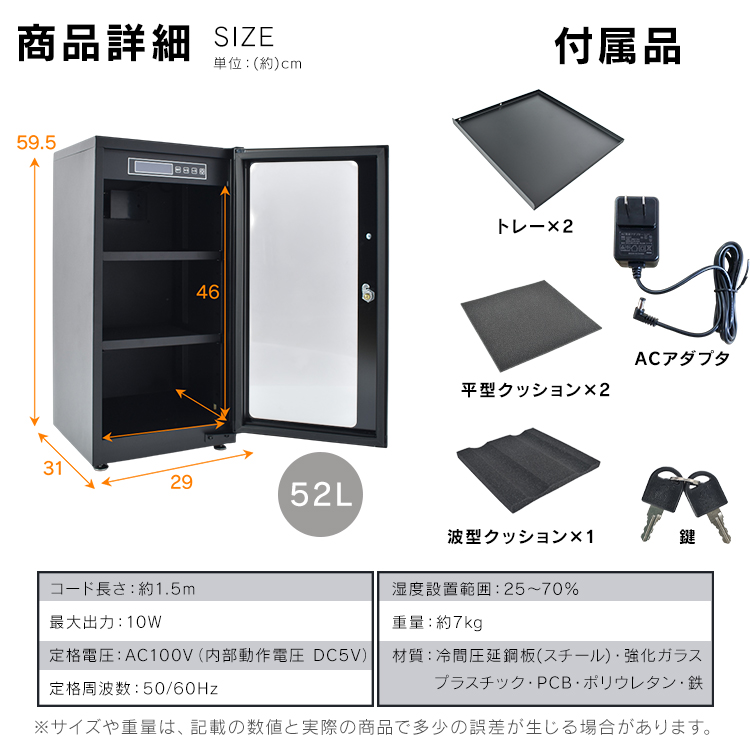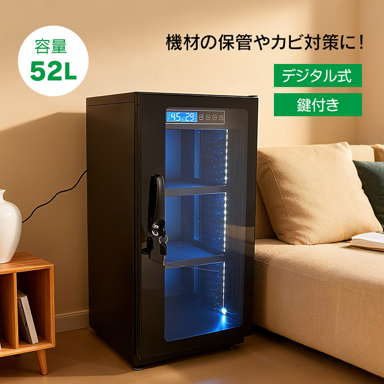防湿庫 カメラ レンズ 一眼レフ 保管 52L 中型 大型 大容量 デジタル式 カビ対策 湿気対策 湿度調整 鍵付き LED照明 ドライボックス 収納 静音 省エネ