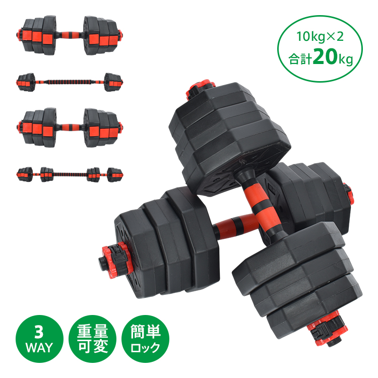 ダンベル 20kg 2個セット 10kg×2セット 可変式 3way バーベル シャフト付き ワンタッチロック 静音 傷防止 八角形 八角ダンベル ダンベルセット 鉄アレイ