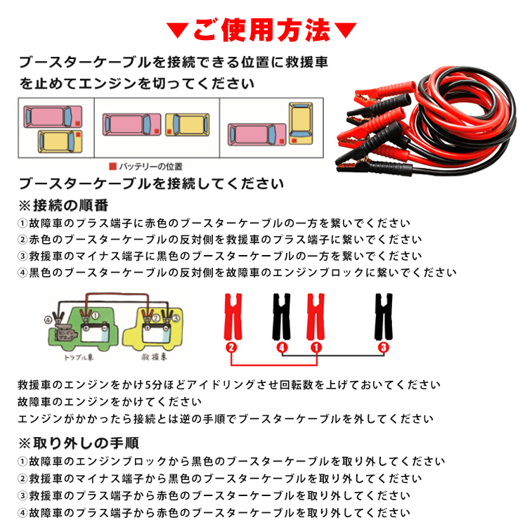 | 注意・説明 | ※ブースターケーブルの種類が車の電圧に合っていないと、発熱・火傷・火災が起きやすくなります ※劣化した場合、短絡・ショートの危険性が高くなります ※接続時に片手にブースターケーブルをまとめて持つと、クリップ部分が接触する可能性があります ※大変危険なので、クリップの先端子が接触しないように注意してください ※最後に接続する黒色のブースターケーブルをマイナス端子に繋げると、バッテリーから発生する水素が爆発を起こす可能性があります ※エンジンの始動に全電力を投入するために、故障車の電装品(オーディオなど)はすべてOFFにしてください ※仕様は改善の為に予告なく変更する場合があります。 ※ディスプレイ画面等の環境上、写真と実際の商品の色とは多少違う場合がございます。 ※海外輸入商品により、汚れ/ダメージ等がついている場合がございます。 ★以上、ご同意の上、ご購入ください! |