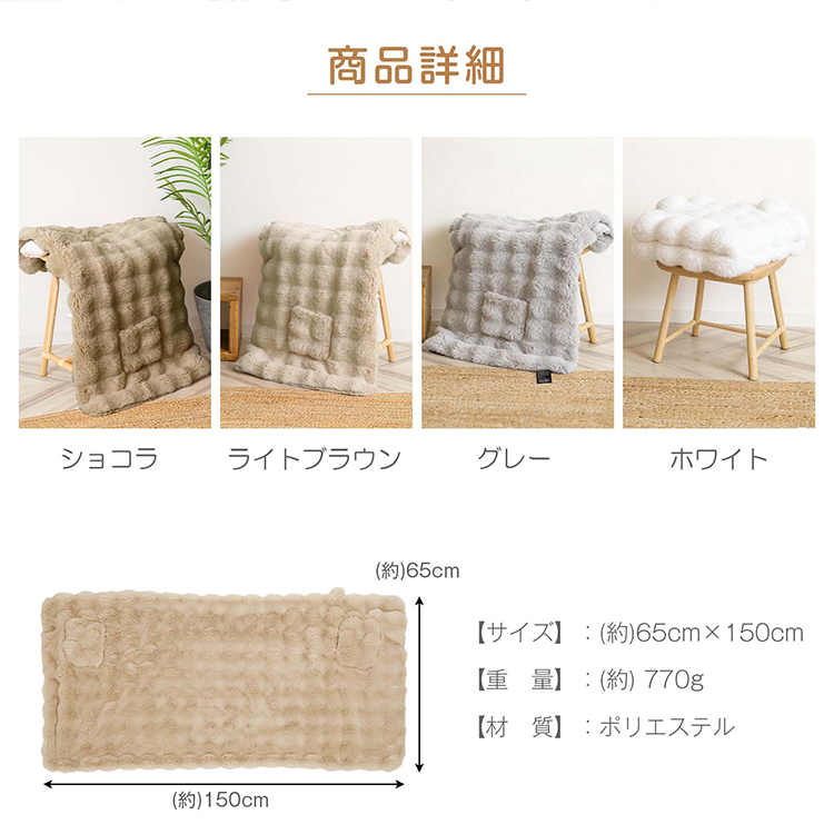 | 種類・サイズ | ・カラー:ライトブラウン/ショコラ/ホワイト/グレー ・サイズ:(約)65×150cm |