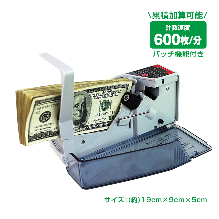 | その他 | ・消費電力:2W ・計数速度:600枚/分 ・最大セット枚数:新札150枚/流通券120枚 ・電源:単三電池×4(別売り) |