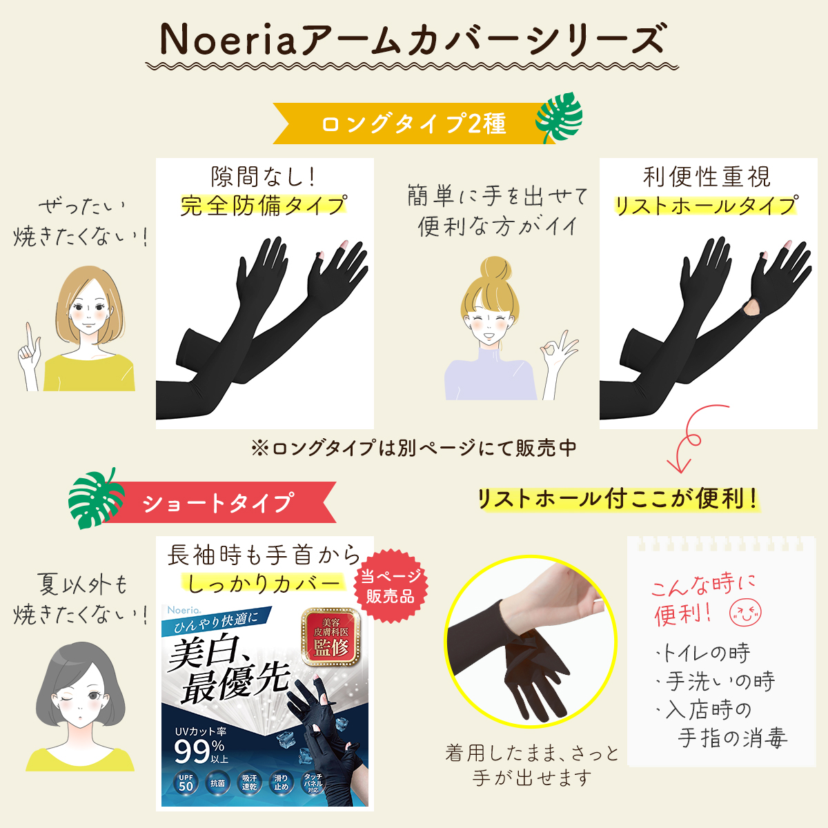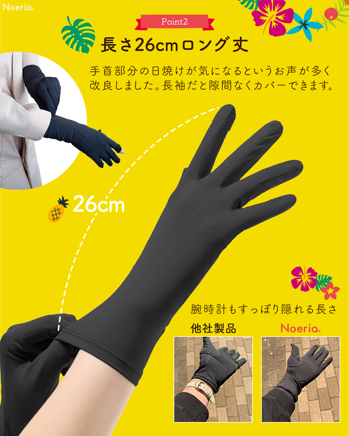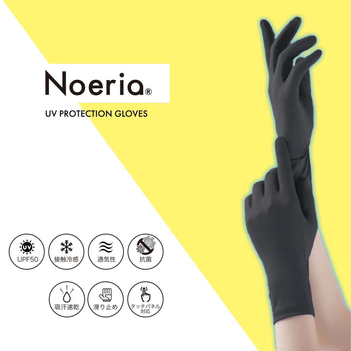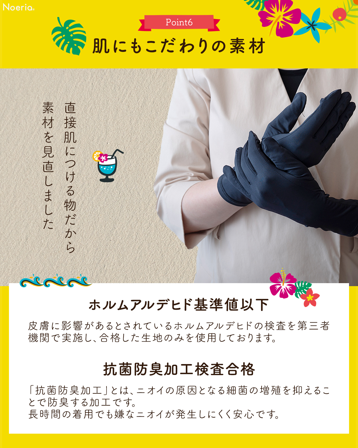 【手首までカバーできる安心のロング丈】現役美容皮膚科監修のもと開発した高品質UVカット手袋。手首部分が伸びたことで、肌を保護する範囲が広がりました。さらに、より快適にご使用いただけるよう抗菌生地へ変更しました!Noeriaオリジナル商品。