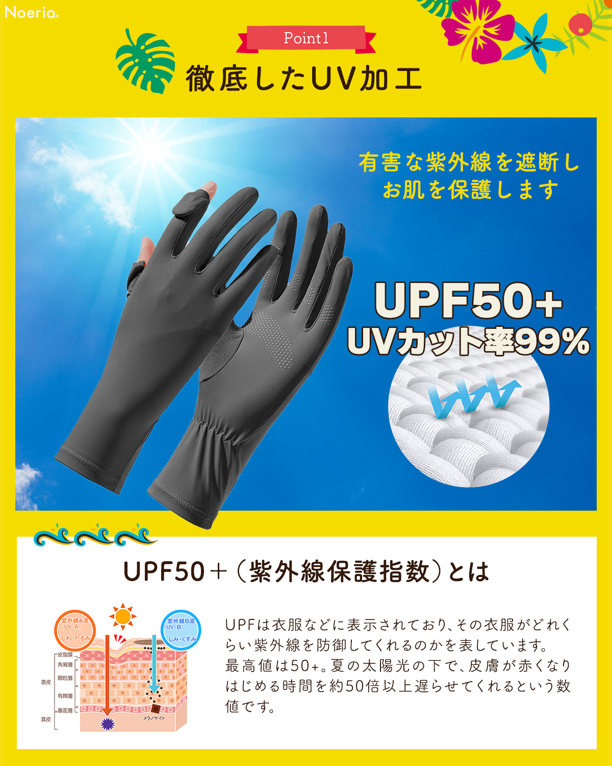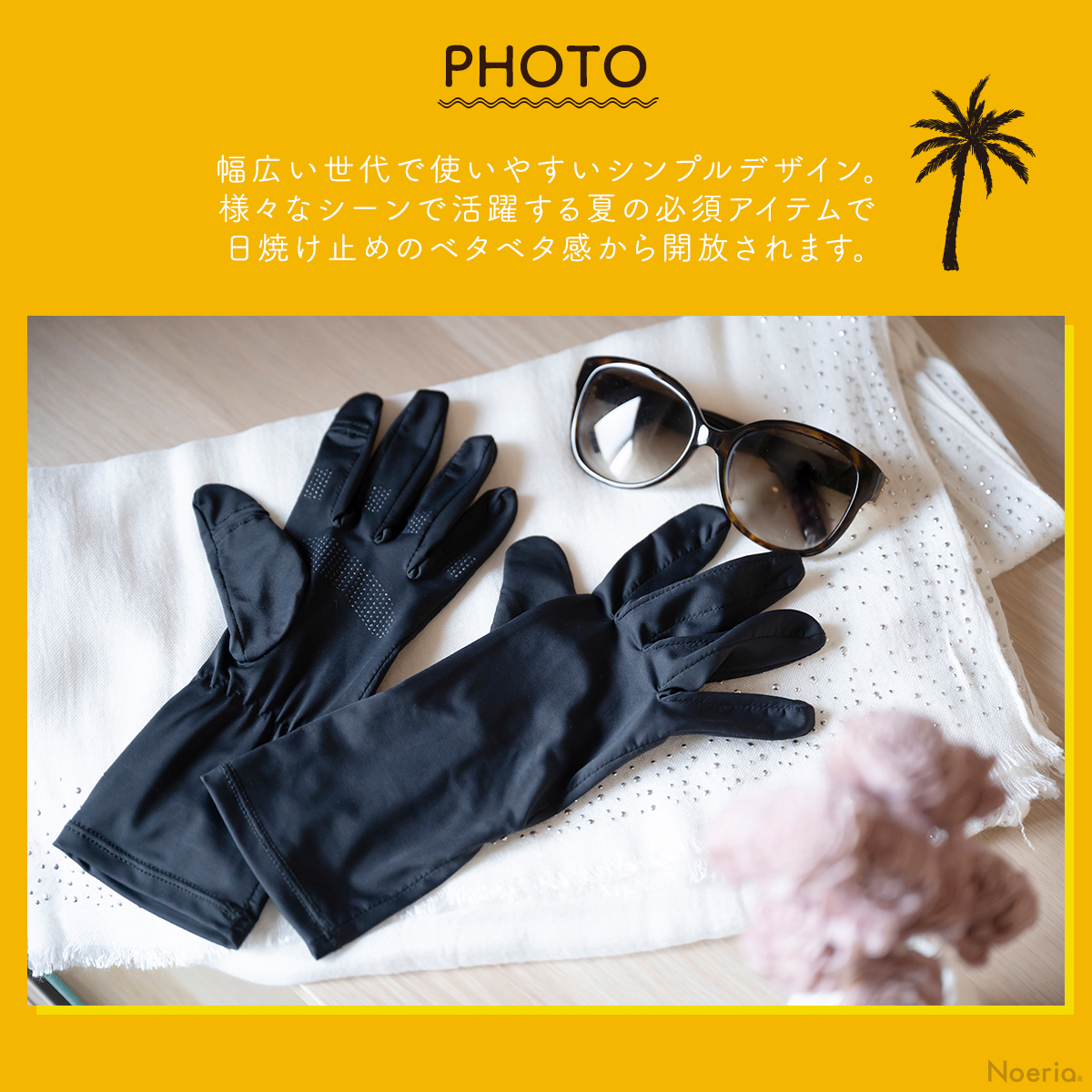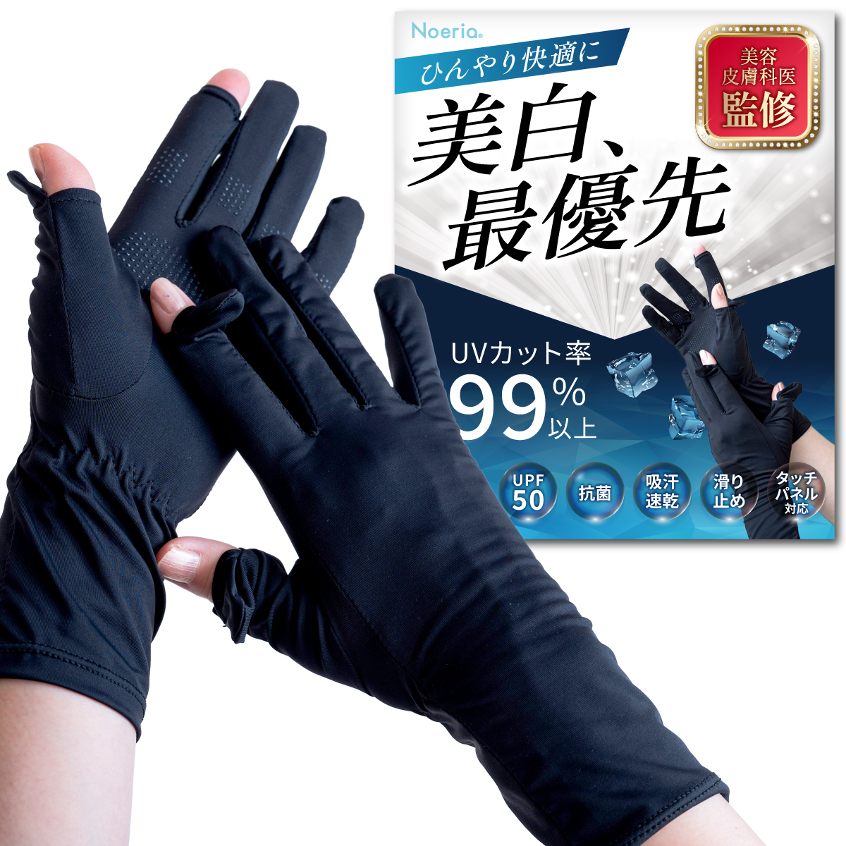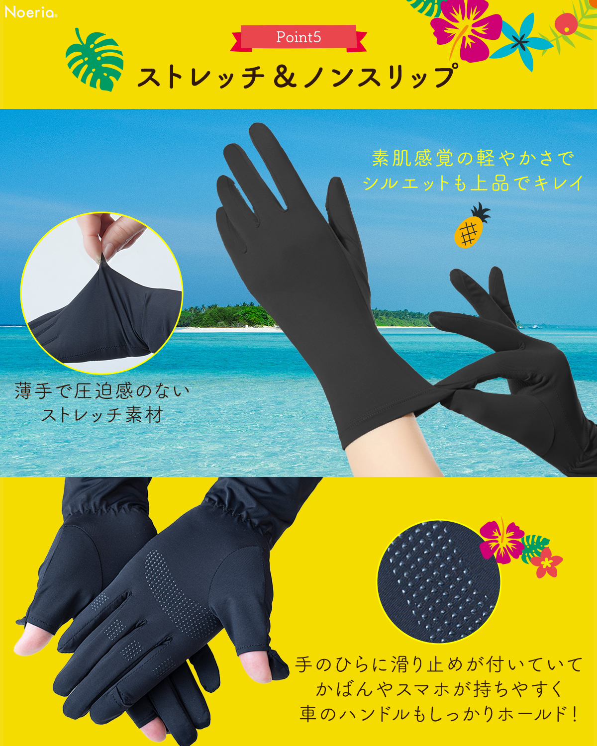 【手首までカバーできる安心のロング丈】現役美容皮膚科監修のもと開発した高品質UVカット手袋。手首部分が伸びたことで、肌を保護する範囲が広がりました。さらに、より快適にご使用いただけるよう抗菌生地へ変更しました!Noeriaオリジナル商品。