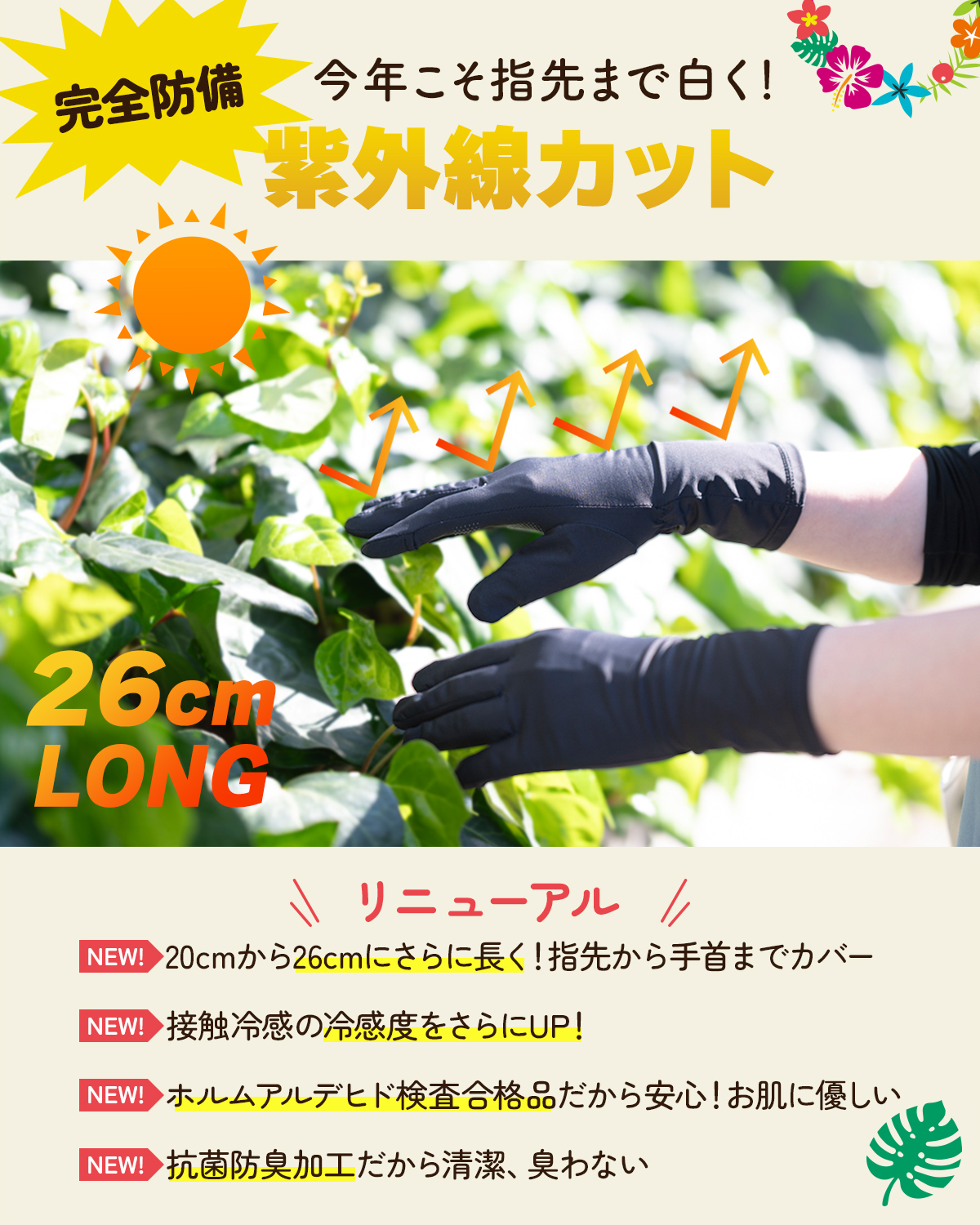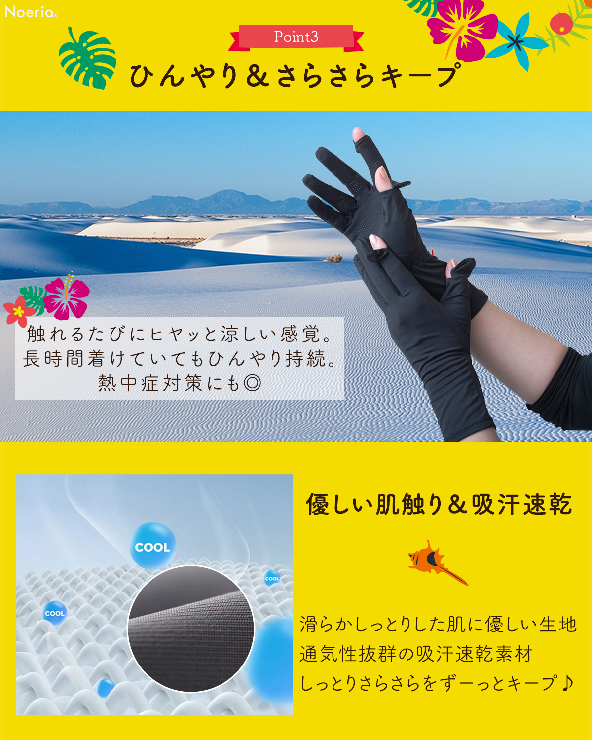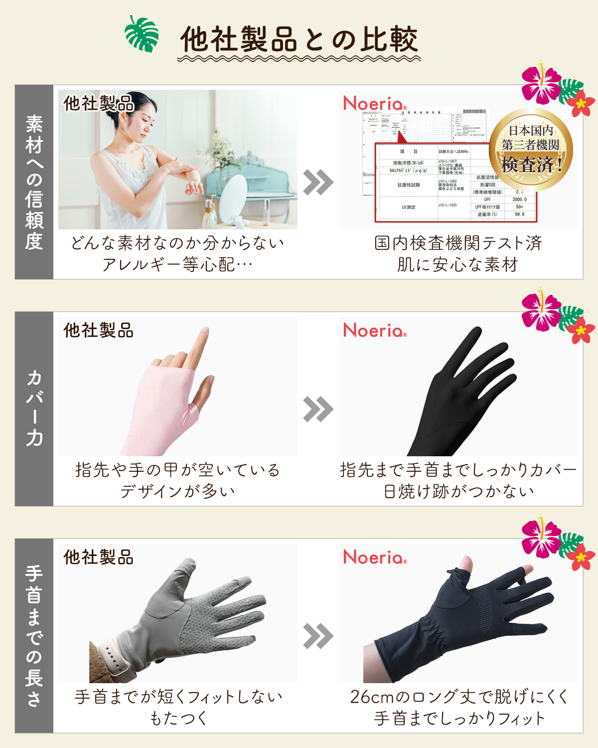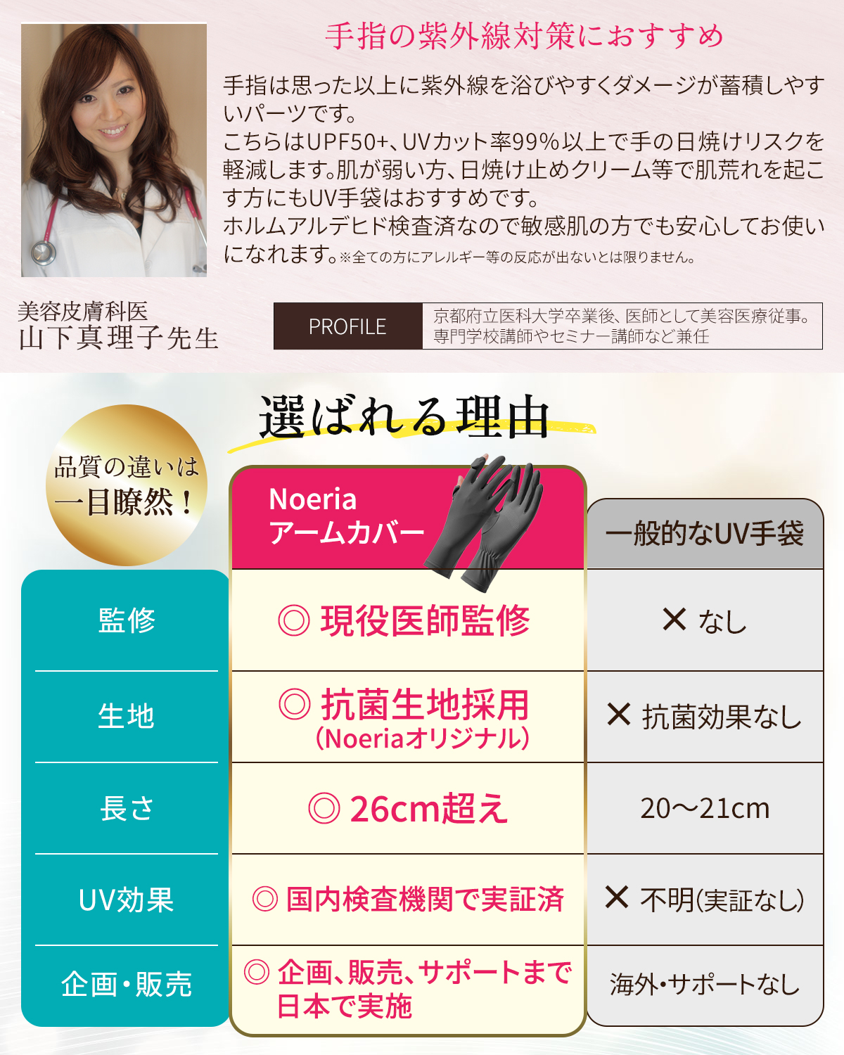 【手首までカバーできる安心のロング丈】現役美容皮膚科監修のもと開発した高品質UVカット手袋。手首部分が伸びたことで、肌を保護する範囲が広がりました。さらに、より快適にご使用いただけるよう抗菌生地へ変更しました!Noeriaオリジナル商品。