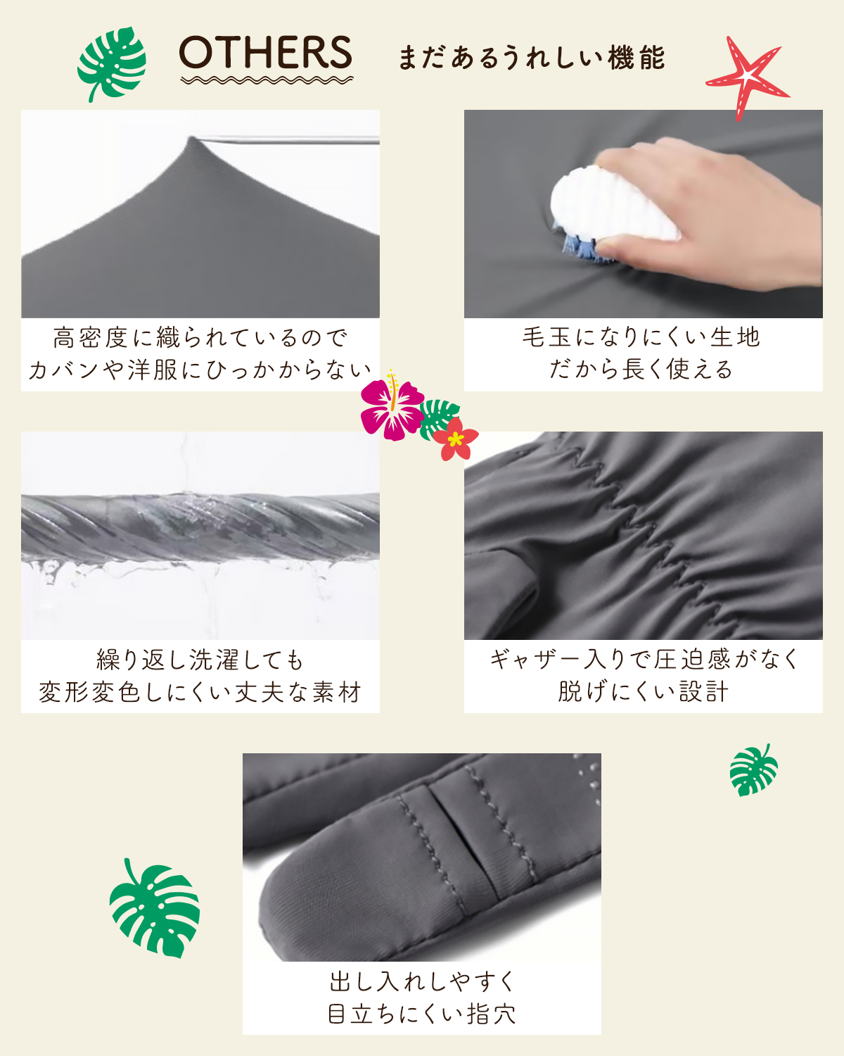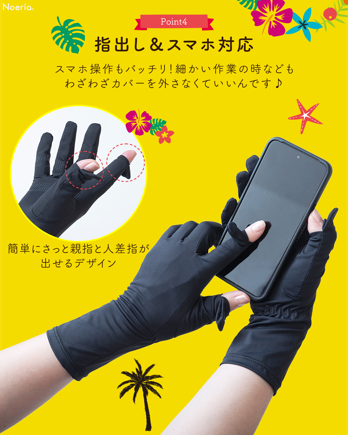 【スマホ対応設計】便利な指出しデザイン。車の運転や自転車でも滑りにくい滑り止め加工。素肌感覚の軽やかさでシルエットも上品で綺麗。
