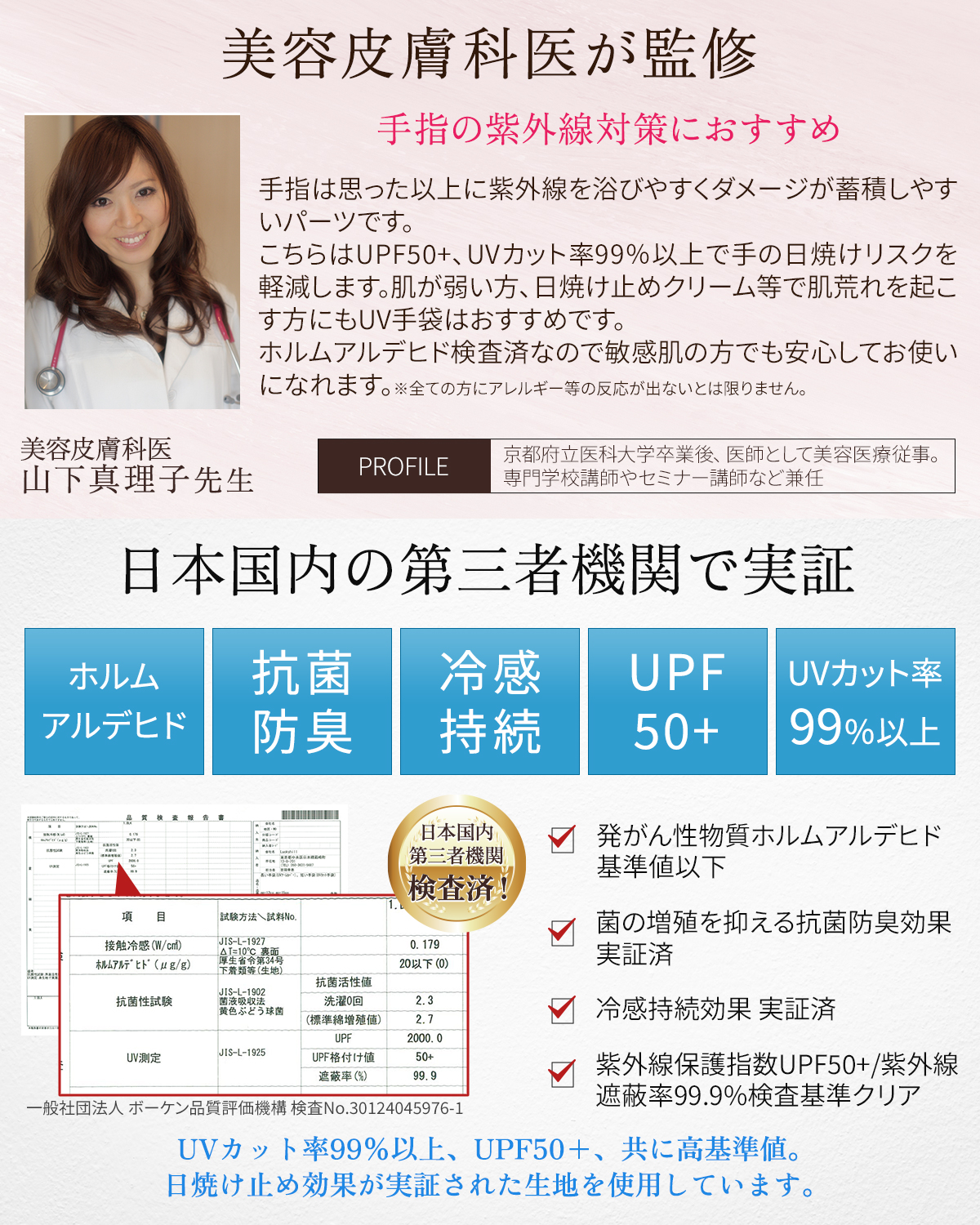 【国内検査機関にて検査済】品質検査を実施し合格した生地のみを使用。接触冷感検査、抗菌性検査、ホルムアルデヒド検査クリア。紫外線遮蔽率(UVカット率99%以上)と紫外線保護指数(UPF50+)認証取得済。