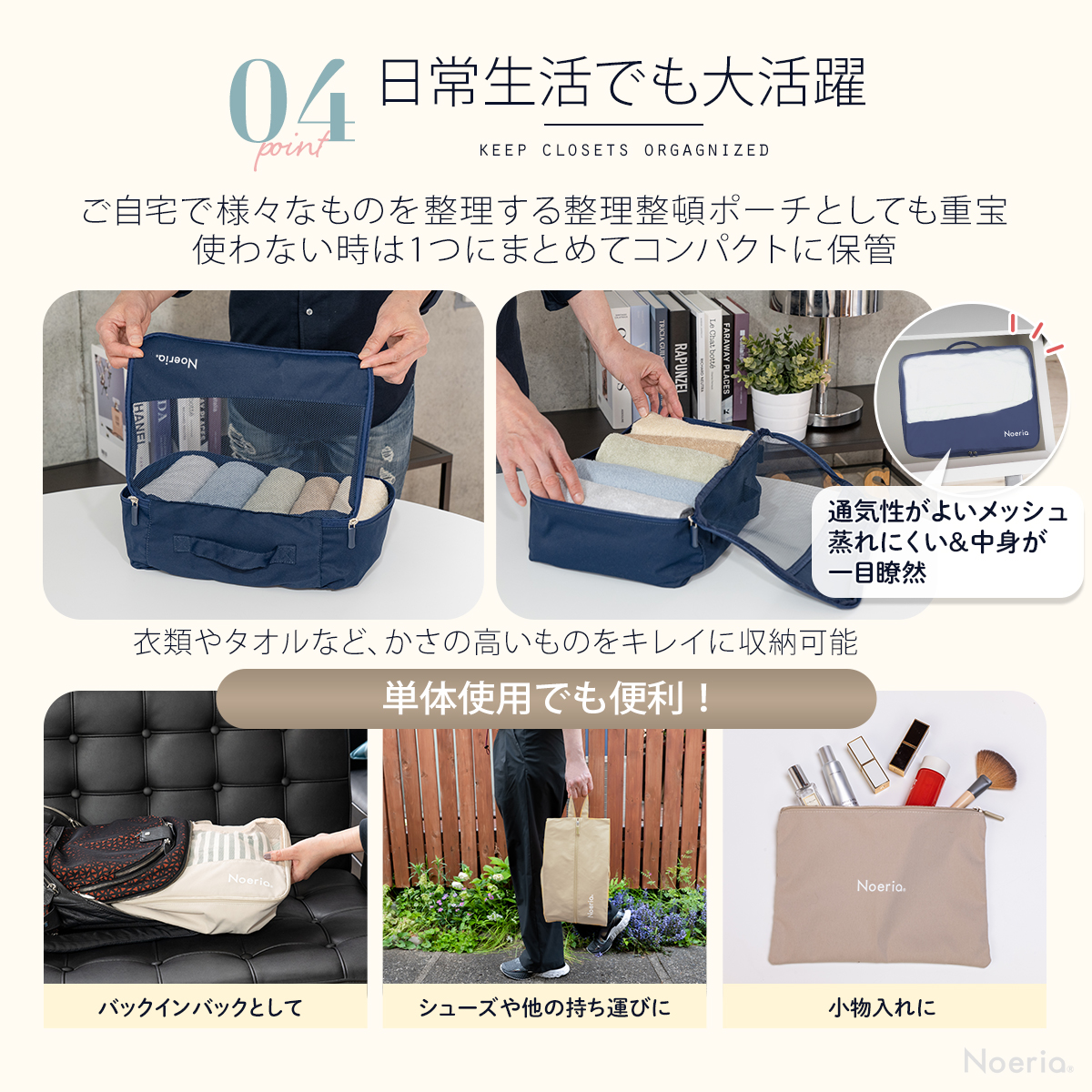 【楽々パッキング】「パッキングは面倒だしどうしたらいいかわからない」というあなたに。Noeriaポーチを使用すると、そんな悩みから解放され、むしろパッキングが楽しくなります。