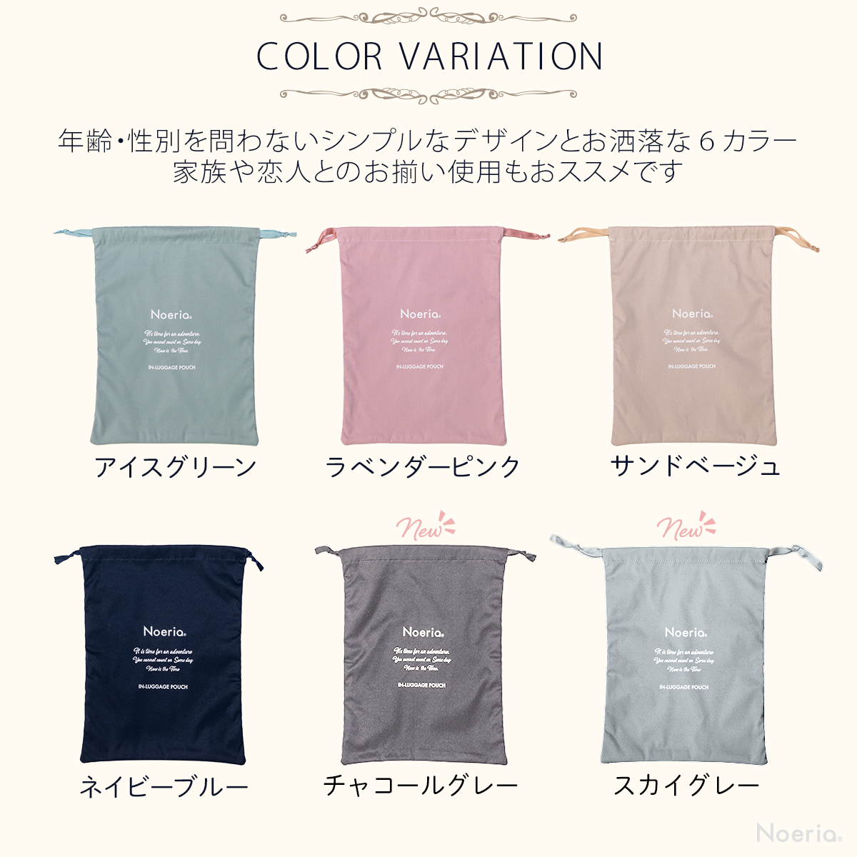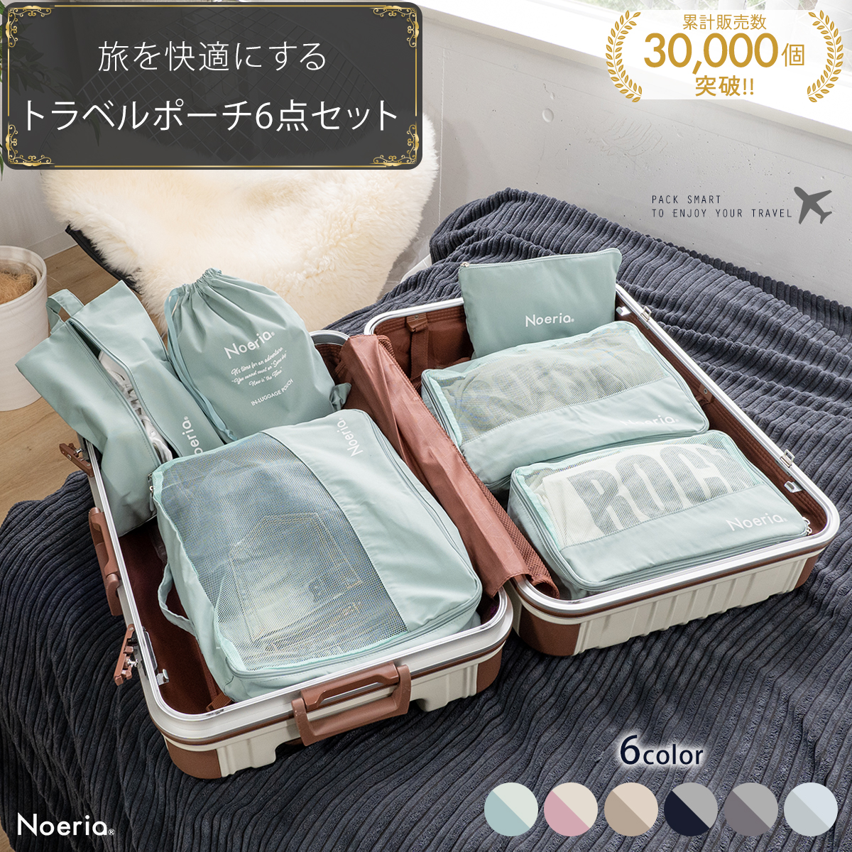 【旅を快適にするトラベルポーチ6点セット】 しっかりした生地と縫製が大好評!コットンのような優しい手触りが特徴のNoeriaポーチ 愛嬌ある可愛い形に旅行中和みます♪ サイズ・形状が異なるアレンジケース6点。衣類、シューズ、小物、目的にあわせてお好きに収納。快適な手触りの布地。スーツケース内が整理されるだけでなく、統一されたデザインとカラーで見た目もスッキリ!