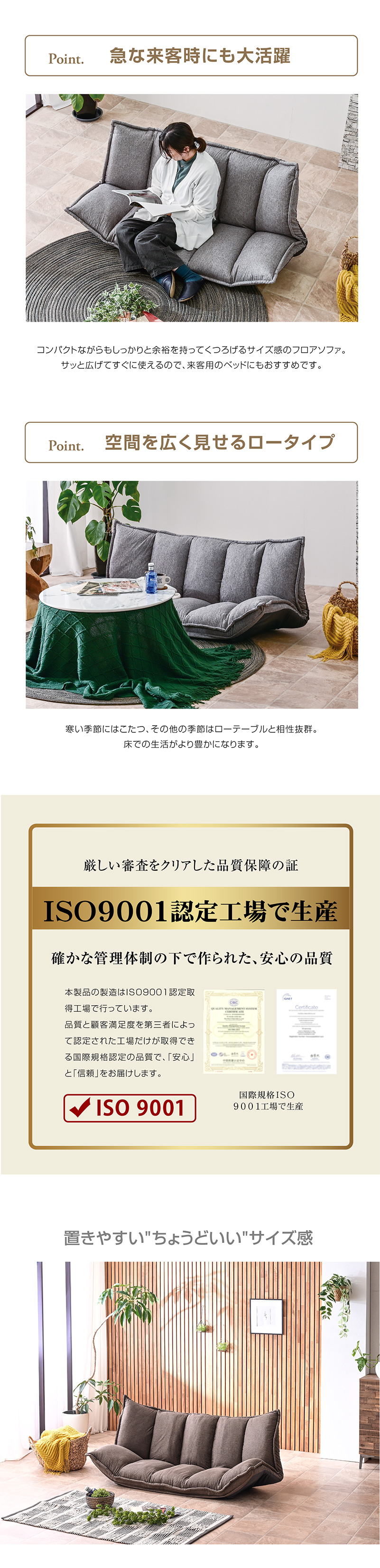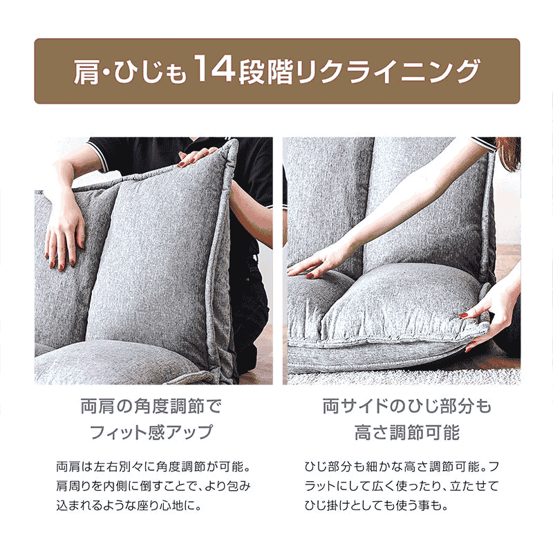 | 当店の おすすめ ポイント | 【完成品】 ・ふっくら極厚ボリュームのリクライニングソファ ・多彩なカラバリでコーデの幅もひろがる ・5か所×14段階リクライニングで自分だけのオーダーメイド ・どんなリラックス体勢でもホールド ・ソファにもベッドにもなる3WAYスタイル ・座面の高さは18cmで安心してくつろげる ・肌触りがよく、通気性が高いファブリック生地 ・コンパクトながらも余裕をもってくつろげるサイズ感 ・サッと広げて使えるため、来客用のソファとしても ・寒い季節はこたつ、その他の季節はローテーブルと相性抜群 ・ISO認定工場で生産だから安心の品質 |