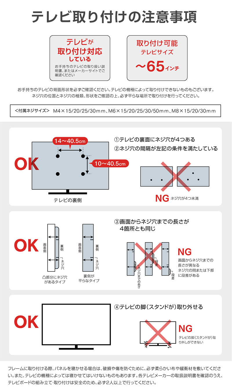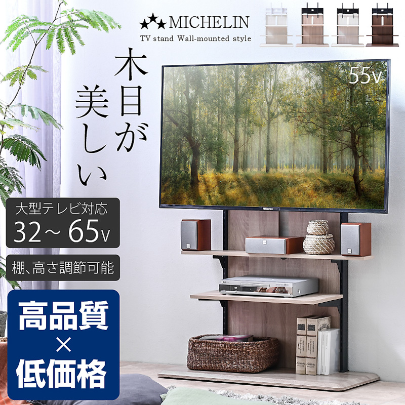 | 当店の おすすめ ポイント | ・木目が美しい仕上がり ・穴開け不要 賃貸でも安心 ・ソファと相性のいいハイスタイル ・どこにでも設置できる自立式 ・広々使える収納スペース ・見やすい高さに調節可能(13個の穴で調節) ・テレビサイズに合わせて取付バーも無段階調節 ・正面から見えない隠し調整ネジ ・可動棚付きですっきり収納 ・棚の移動は穴に引っ掛けるシンプルな取付け ・幅広く設置可能 2枚の棚板完備 ・棚板を付けず使用しても様になる ・コード通し穴付きで配線がしやすい ・傷、汚れに強いメラミン強化シート貼り ・スチール粉体塗装仕上げ ・裏面には傷を防止する足裏パーツ付き |