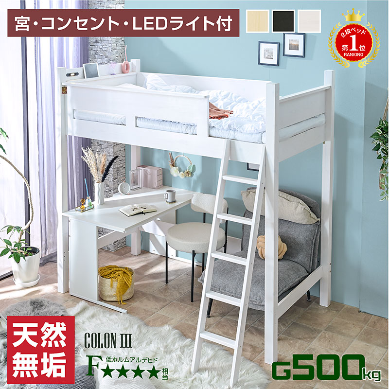 | 当店の おすすめ ポイント | ・LEDライト付き スイッチは宮棚に付いて便利 ・コンセント付きでスマホの充電も就寝中に出来ます。 ・ネガネや小物も置ける宮棚付き、ズレ防止の溝付きでスマホスタンドとして ・耐荷重試験500kgをクリア、大人の方でも安心してお使い頂けます ・ベッド下は自由な大空間を有効活用できます。 ・丈夫な70mm角柱を採用し、しっかりした安定性 ・スノコ4か所受けで丈夫、大人でも安心してお休みいただけます ・シンプルなデザインでお子様から大人までお使い頂けます。 ・出入り口やハシゴの位置が変更できます。 ・学習机をセットすれば、子供部屋の出来上がり。 |