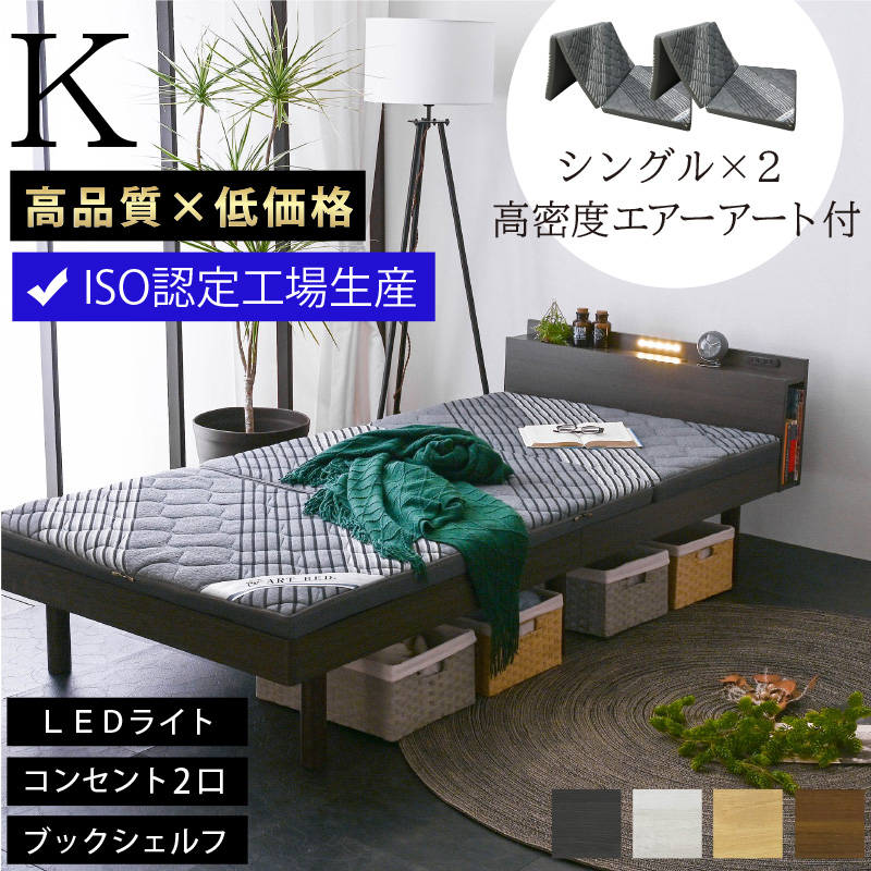 高品質×低価格 シングル2台 (三つ折りマットレス エアーアート2枚付) すのこベッド LED照明 宮付き 高さ調節 コンセント付 木製 ローベッド ロマン
