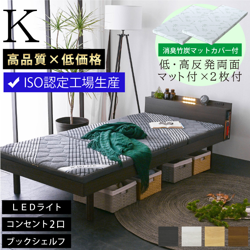 高品質×低価格 シングル2台 (低・高反発両面マットレス2枚付) すのこベッド LED照明 宮付き 高さ調節 コンセント付 木製 ローベッド ロマン