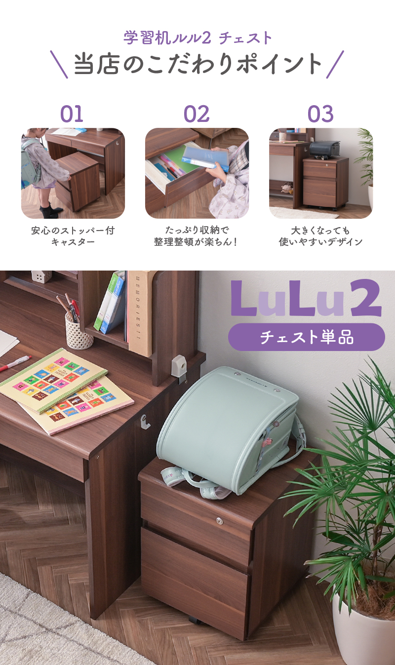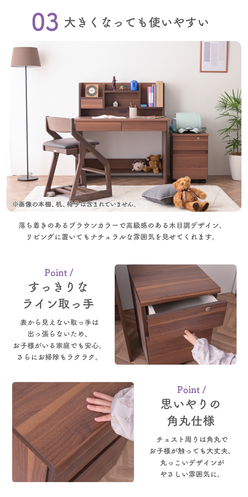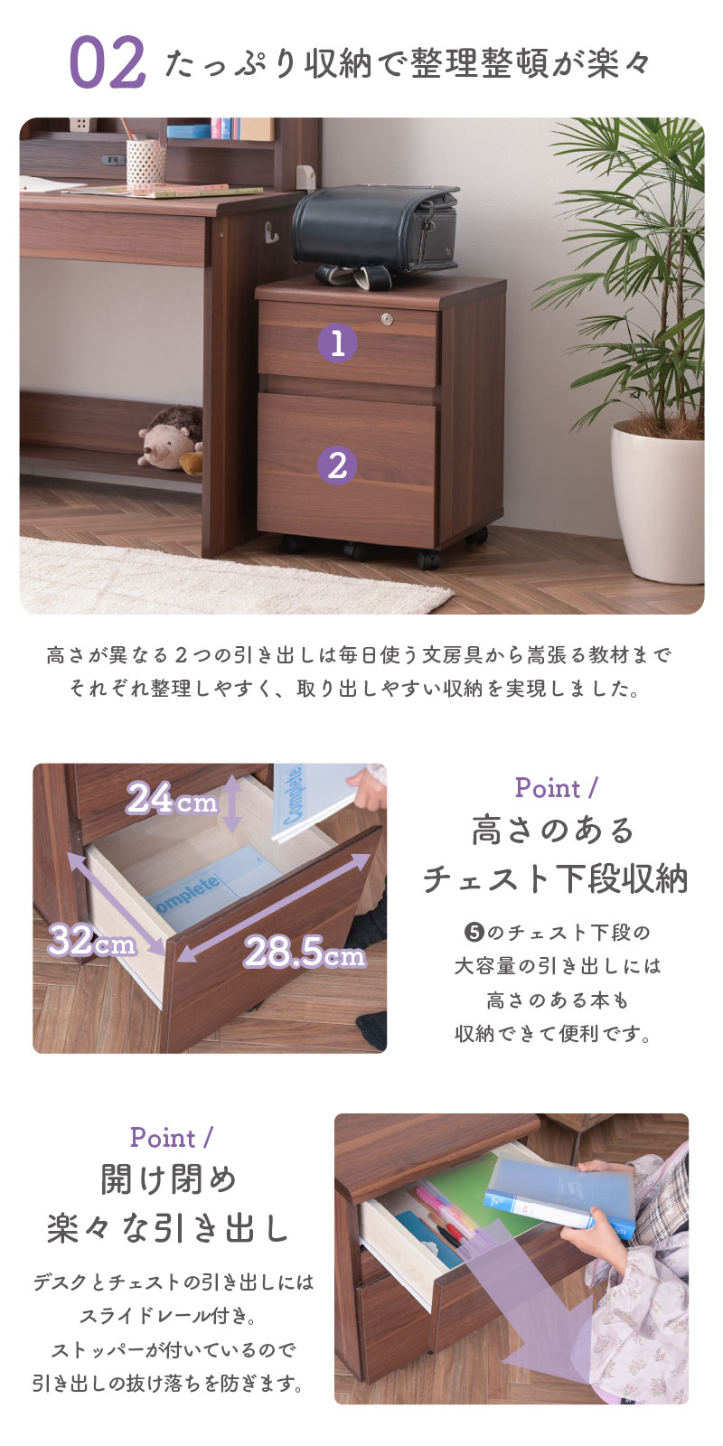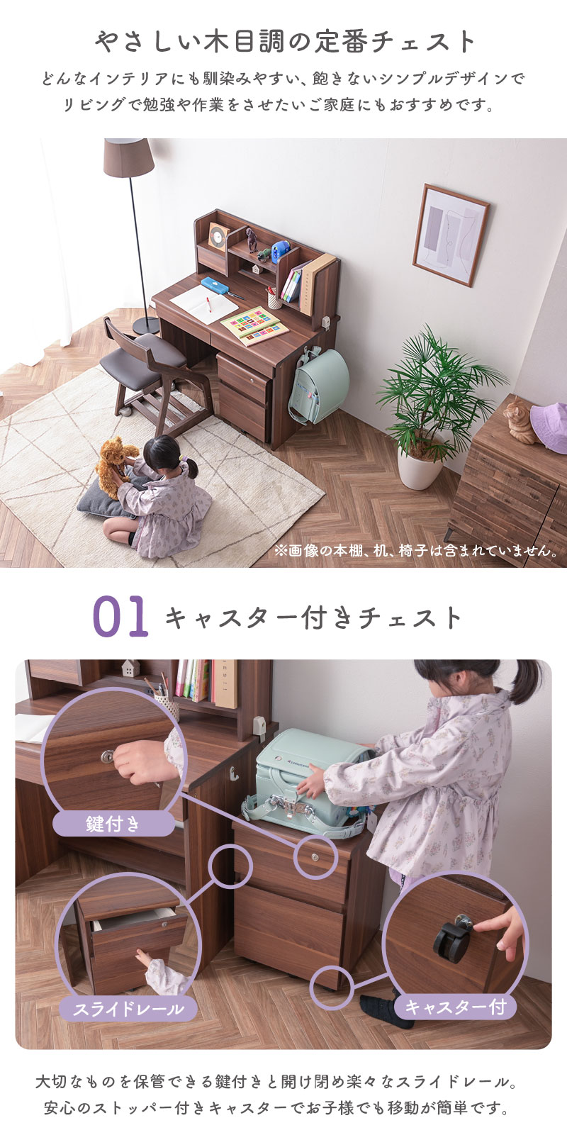 | 特徴 | ・どんなインテリアにも馴染みやすい、飽きないシンプルデザイン ・大切なものを保管できる鍵付き ・開け閉め楽々なストッパー付きスライドレール ・安心のストッパ付きキャスターでお子様でも移動が簡単 ・高さのある下段収納はA4サイズも入る ・表から見えないスッキリなライン取っ手 ・チェスト周りは角丸でお子様が触っても大丈夫 |