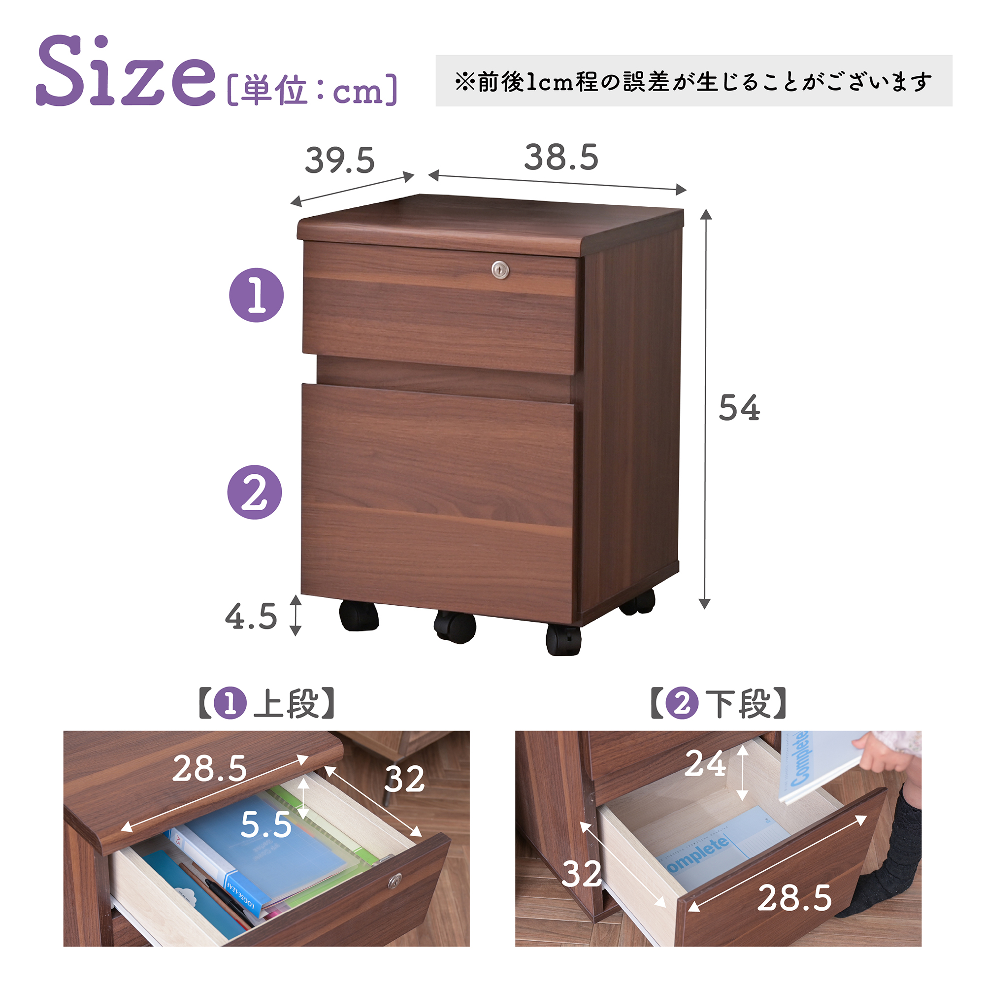 | サイズ (cm) | 幅38.5×奥行き39.5×高さ54 【引き出しの内寸】 (上段)幅28.5×奥行き32×高さ5.5 (下段)幅28.5×奥行き32×高さ25.5 |
