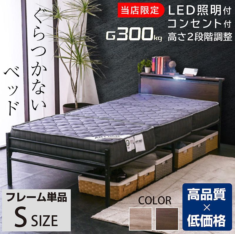 | 当店の おすすめ ポイント | \異素材ミックスベッド/ ・スチールフレームに木目調のヘッドボードを組み合わせたシンプルモダンベッド ・フレーム補強パーツ&ベッド中央部分に脚2本を追加して強度アップ! ・コンセント、宮棚、LEDライト付き ・2段階高さ調節(ハイモード、ローボード) ・ハイタイプには薄め、ロータイプには厚めのマットレスがおすすめ ・強度の高い12本のサポートバーとメッシュ床で耐圧を分散 ・強いスチールパイプをしっかり連結して、がたつきや軋み音を軽減 ・錆びにくいパウダーコーティング加工 ・床の傷防止とベッドのずれをなくすアタッチメント付き ・通気性の良いメッシュ構造を採用 ・シングルベッド2台でキングサイズにも |