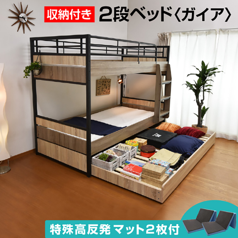 特殊 高反発マットレス2枚付 収納付き 2段ベッド 二段ベッド ガイア-GAIA アイアン 大人用 子供用 耐震 コンパクト 寮 社宅 シェアハウス