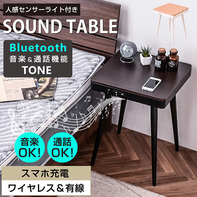 | 特徴 | ・Bluetooth接続で音楽も会話も楽しめるスピーカーテーブル ・ワイヤレス充電搭載でスマホも簡単充電 ・有線充電用のUSBポートも搭載 ・人感センサー搭載の誘導灯(LEDライト) ・お洒落な選べるカラー2色を用意 |