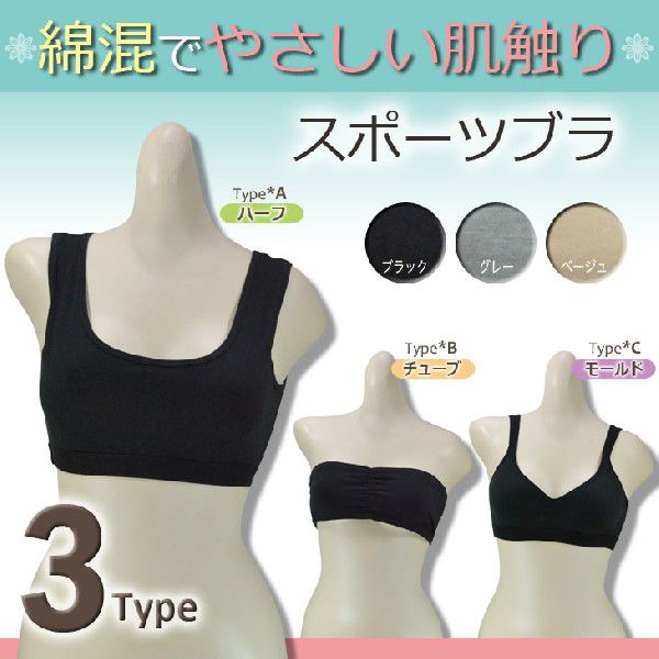 【商品番号】・ZB-051【カラー】・ブラック、グレー、ベージュ【サイズ】・M、L、LL【タイプ】・ハーフ、チューブ、モールド【素材】・(身生地)ポリエステル、綿、ポリウレタン(ゴム部分)ナイロン、ポリウレタン【詳細】・スポーツブラ・ワイヤー:なし・パット:なし・ホック:なし・ストラップ:取り外し不可(チューブタイプはストラップホルダーあり)