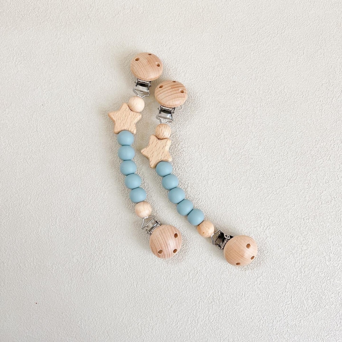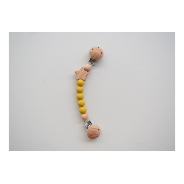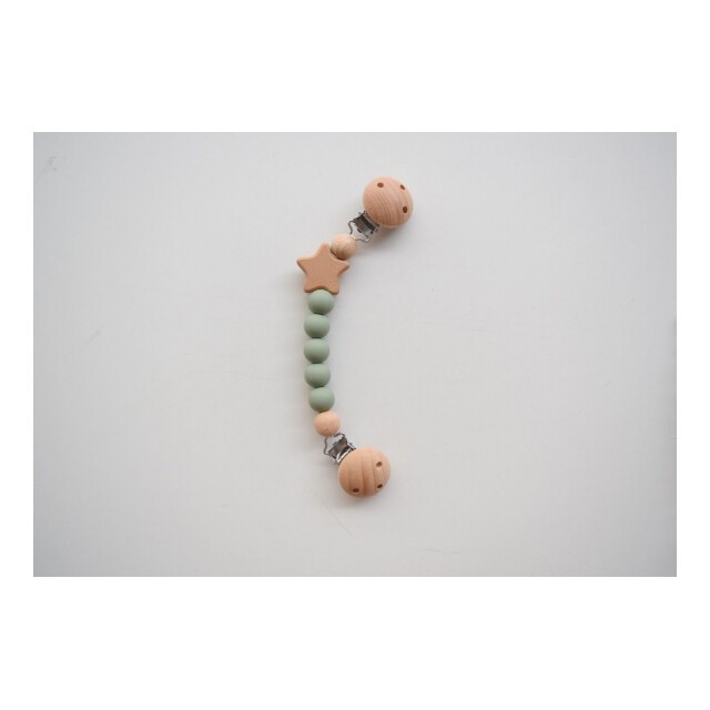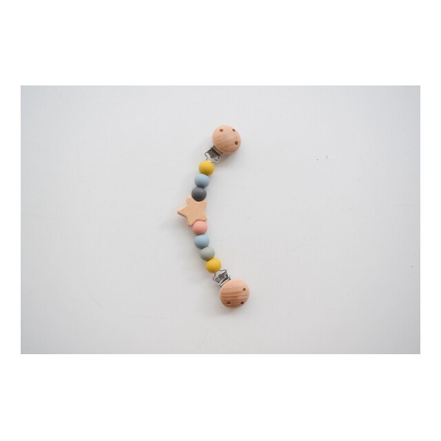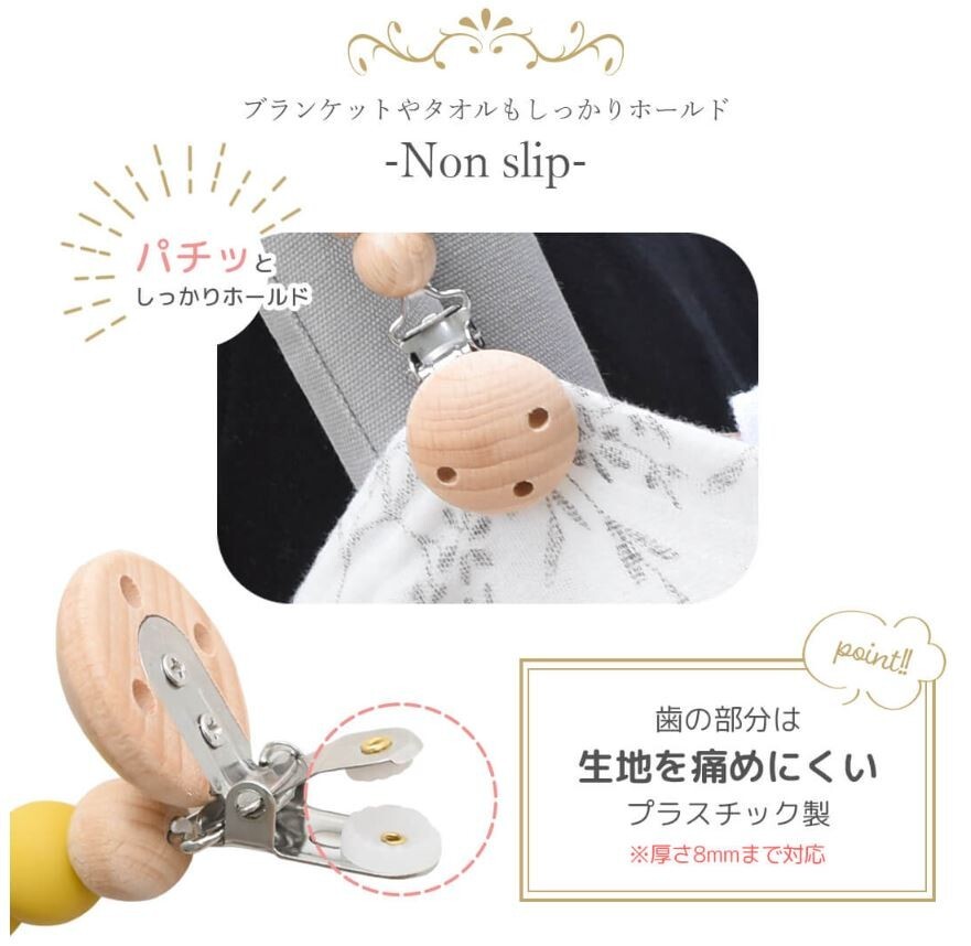 ブランケットやタオルがずり落ちるのを防ぐかわいいクリップ。ベビーに優しい天然木とシリコン使用、木製の星がポイントです。