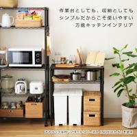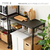 作業台にもなる、天板が選べるキッチンラック ルミナスのノワールシリーズの中でも人気のキッチン収納です。下のスペースが解放されているため、ゴミ箱上のスペースを有効活用することができます。例えば、レンジや炊飯器などの家電置きとして使ったり、ちょっとした調理や盛り付けなどをする作業台として使ったりと用途はさまざま。天板はウッドシェルフとソリッドシェルフから選べるので、キッチンの雰囲気に合わせて選べます。
