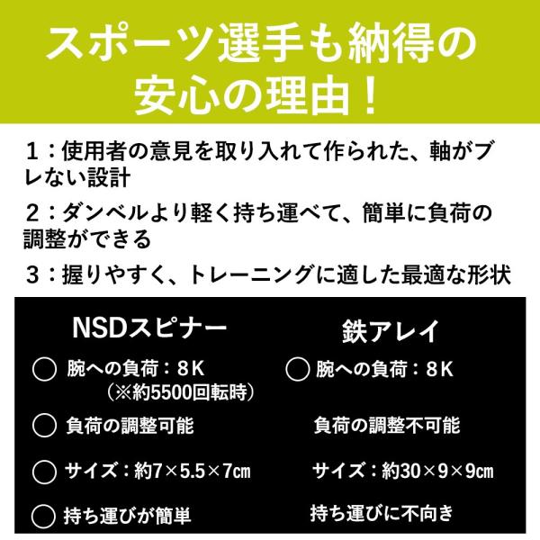 「NSDスピナー」は、自宅でのトレーニングにも最適な本格的なアスリートから一般の方まで使用出来る手首用の握力トレーニング器具です。