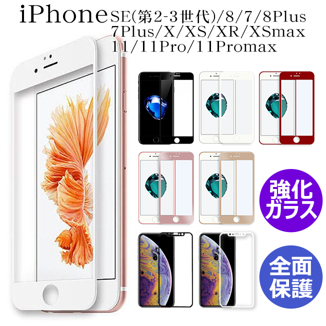 保護フィルム iPhone11 Pro Max iPhoneXR iPhoneX iPhoneXS MAX iPhone8 iPhone7 Plus フルラウンド ガラスフィルム 全面保護 液晶保護 曲面保護 赤 黒 白 桃