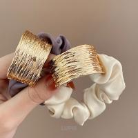 しわ加工のメタルプレート付きシュシュヘアゴム。