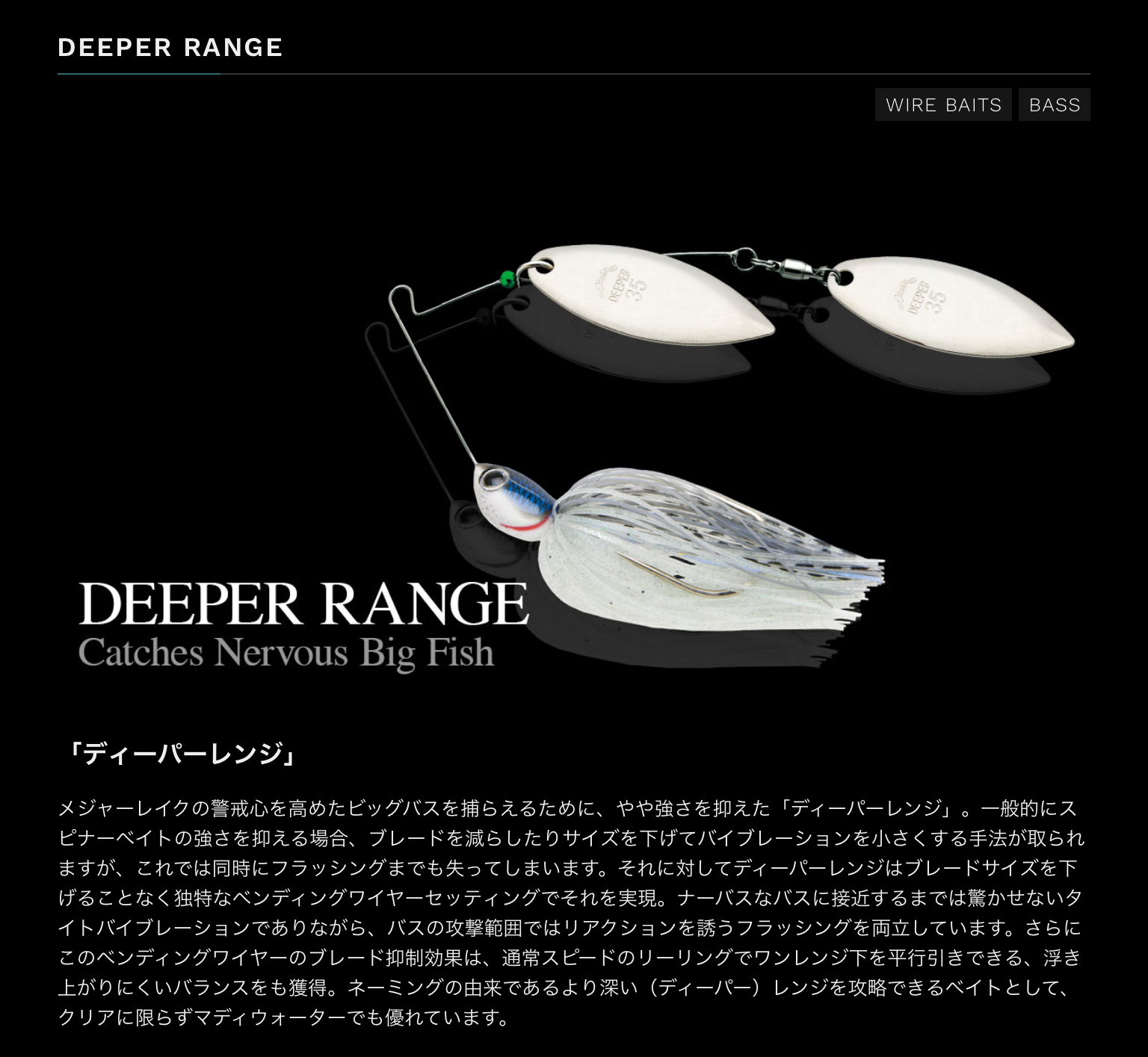 メジャーレイクの警戒心を高めたビッグバスを捕らえるために、やや強さを抑えた「ディーパーレンジ」。一般的にスピナーベイトの強さを抑える場合、ブレードを減らしたりサイズを下げてバイブレーションを小さくする手法が取られますが、これでは同時にフラッシングまでも失ってしまいます。それに対してディーパーレンジはブレードサイズを下げることなく独特なベンディングワイヤーセッティングでそれを実現。ナーバスなバスに接近するまでは驚かせないタイトバイブレーションでありながら、バスの攻撃範囲ではリアクションを誘うフラッシングを両立しています。さらにこのベンディングワイヤーのブレード抑制効果は、通常スピードのリーリングでワンレンジ下を平行引きできる、浮き上がりにくいバランスをも獲得。ネーミングの由来であるより深い(ディーパー)レンジを攻略できるベイトとして、クリアに限らずマディウォーターでも優れています。
