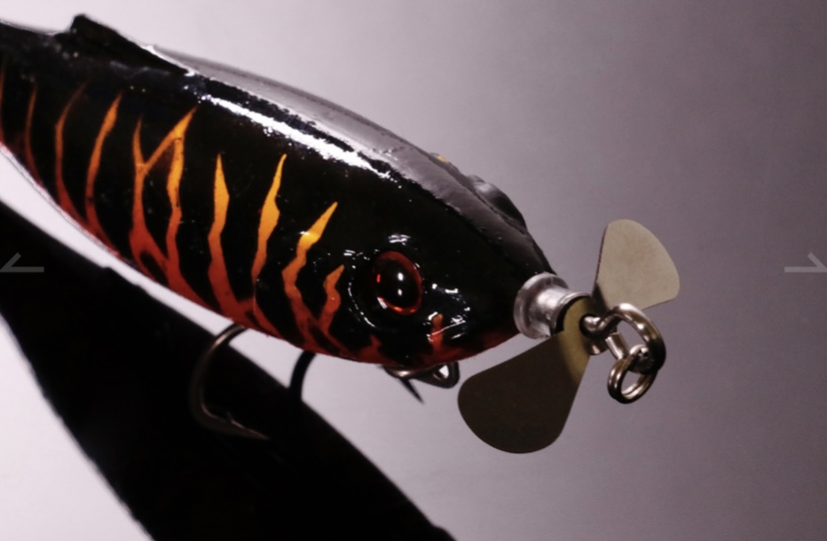 ディズラの要は、ノーズプロップとリッジテール。ノーズプロップは目に見えない強い水流を身にまとい、金属素材のフラッシング効果と回転時の「チリチリ」音を伴って、遠くからバスを呼ぶ効果を持たせています。一方、水流を受け流すリッジテールが、ベイトフィッシュライクでナチュラルな泳ぎを演出し、プロップで寄せたバスを高確率でバイトまで至らせます。