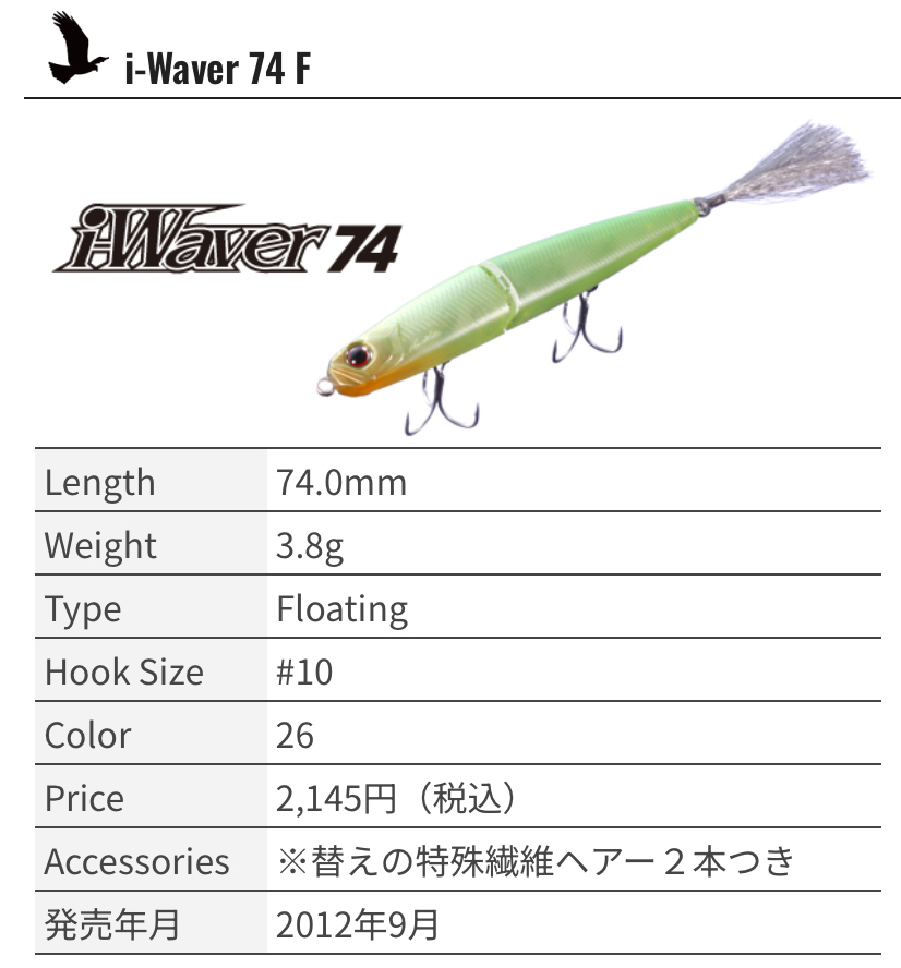 通常のリップ付きミノーによるタダ巻きやジャークなどには反応せず、なおかつワームでも食わせられないという何をやっても反応が悪い状況がある。そんな時はi字ルアーの出番となる。春先の気難しいバスはもとより、年間を通じてビッグバスを狙って仕留めたり、トーナメントで勝つためには避けて通れない釣りで、現代のバスフィッシングにおいて今後さらに大きな存在感を持っていくカテゴリーである。ただし、単にi字というだけではなく、目指したのは最も厳しい状況下でもキャッチできる性能に昇華させること。その為に、通常とは異なる目的のジョイント構造や特殊繊維のヘアー、類を見ない比重設定など勝つためにキモとなるいくつもの要素を搭載し満を持してリリースされる。
