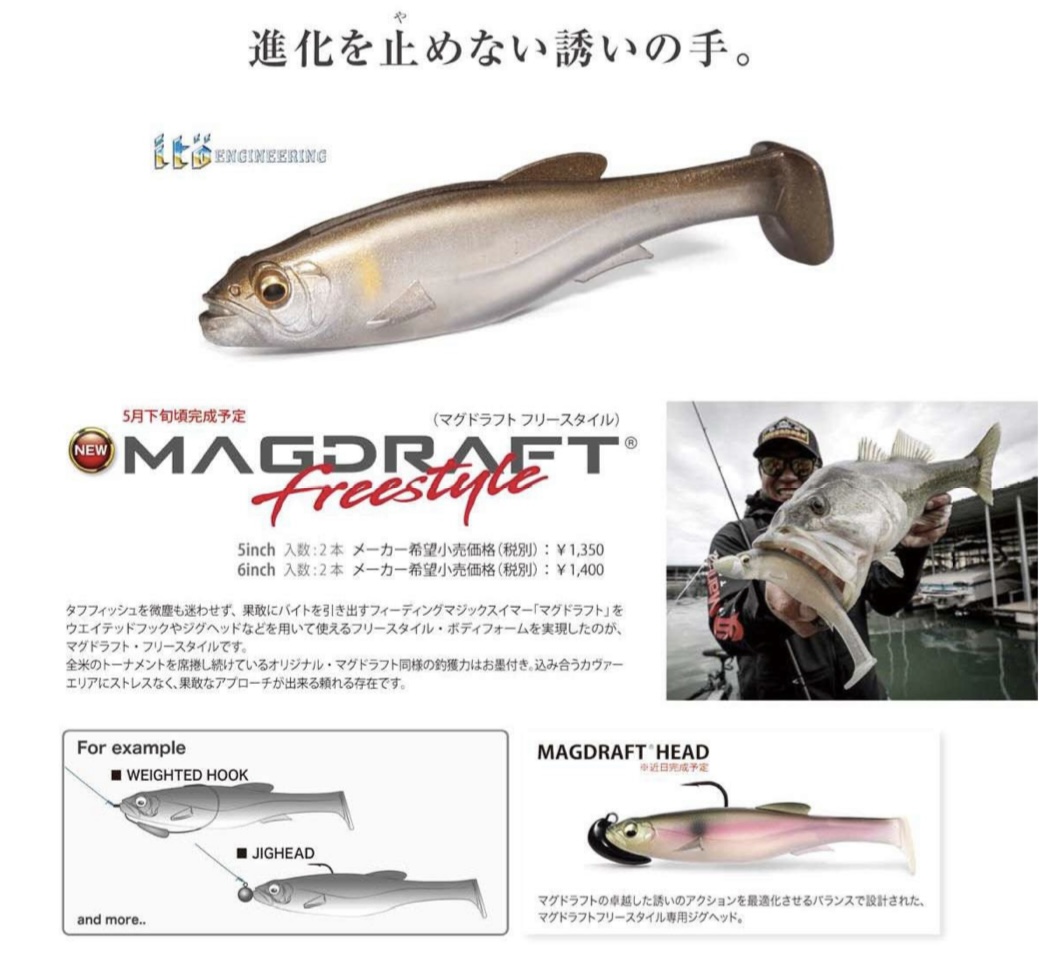 タフフィッシュを微塵も迷わせず、果敢にバイトを引き出すフィーディングマジックスイマー「マグドラフト」をウェイテッドフックやジグヘッドなどを用いて使えるフリースタイル・ボディフォームを実現したのが、マグドラフトフリースタイルです。全米のトーナメントを席捲し続けているオリジナル・マグドラフト同様の釣獲力はお墨付き。込み合うカヴァーエリアにストレスなく、果敢なアプローチが出来る頼れる存在です。