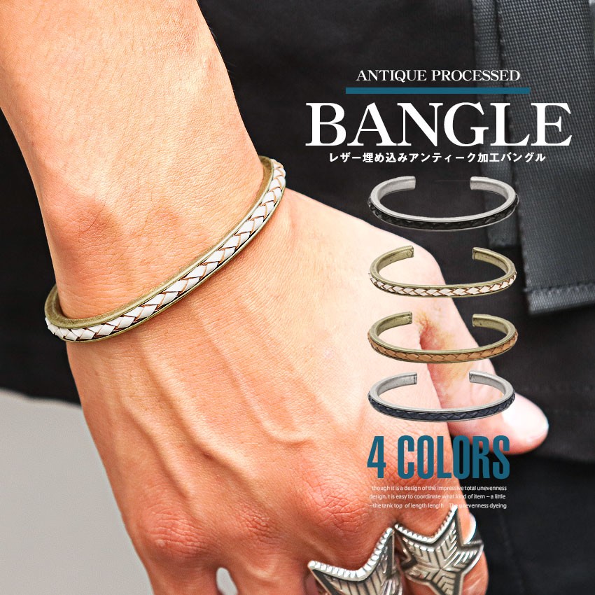 アンティーク調のバングルに編み込みカラーレザーを埋め込んだ一味違うデザイン。