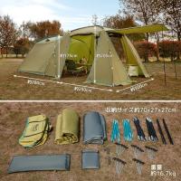 ・2ルーム大型テントサイズ:約610×300×205hcm、インナーサイズ:約300×280×175hcm、人数:4-5人。(1)、インナー面積は広く、最大5人まで寝ることができます。 (2)、リビングと寝室一体の2ルーム設計で、広い前室の中にテーブルやイスなどを置いてリビングとして使え、食事やレジャーに適します。(3)、テント前面キャノピーをドアポールで立てタープとして使うと、居住空間がさらに広くなります。