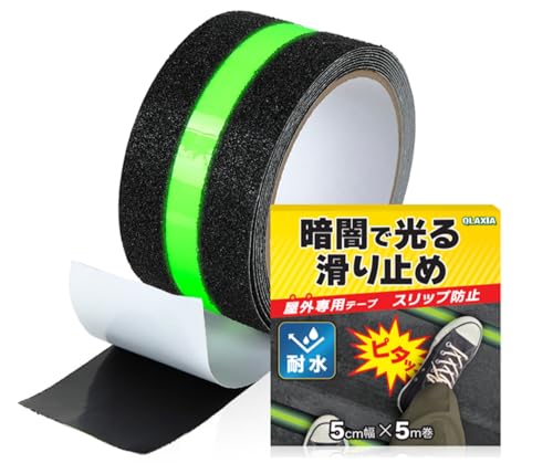 QLAXIA暗闇で光る滑り止めテープ 屋外 階段 転倒防止 防水 すべり止め 5cm幅×5m 蛍光ライン/黒 単品
