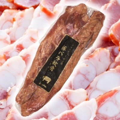 国産豚肉のバラ肉部位の軟骨をすべて使用しております。コラーゲンを逃がさないために塩漬スモークしました。新食感をお楽しみ頂けます。