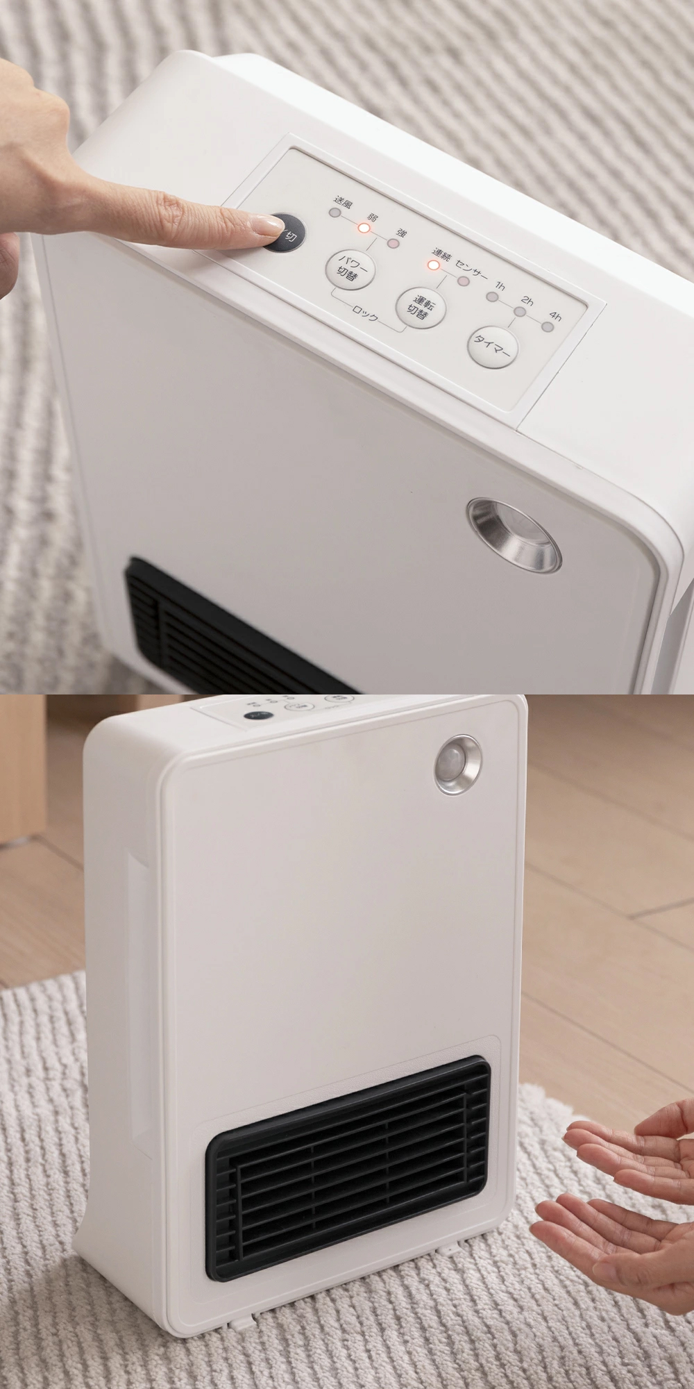 「入/切」ボタンを押して約3秒で温風が出ます。待ち時間なしですぐにあたたまることができます。