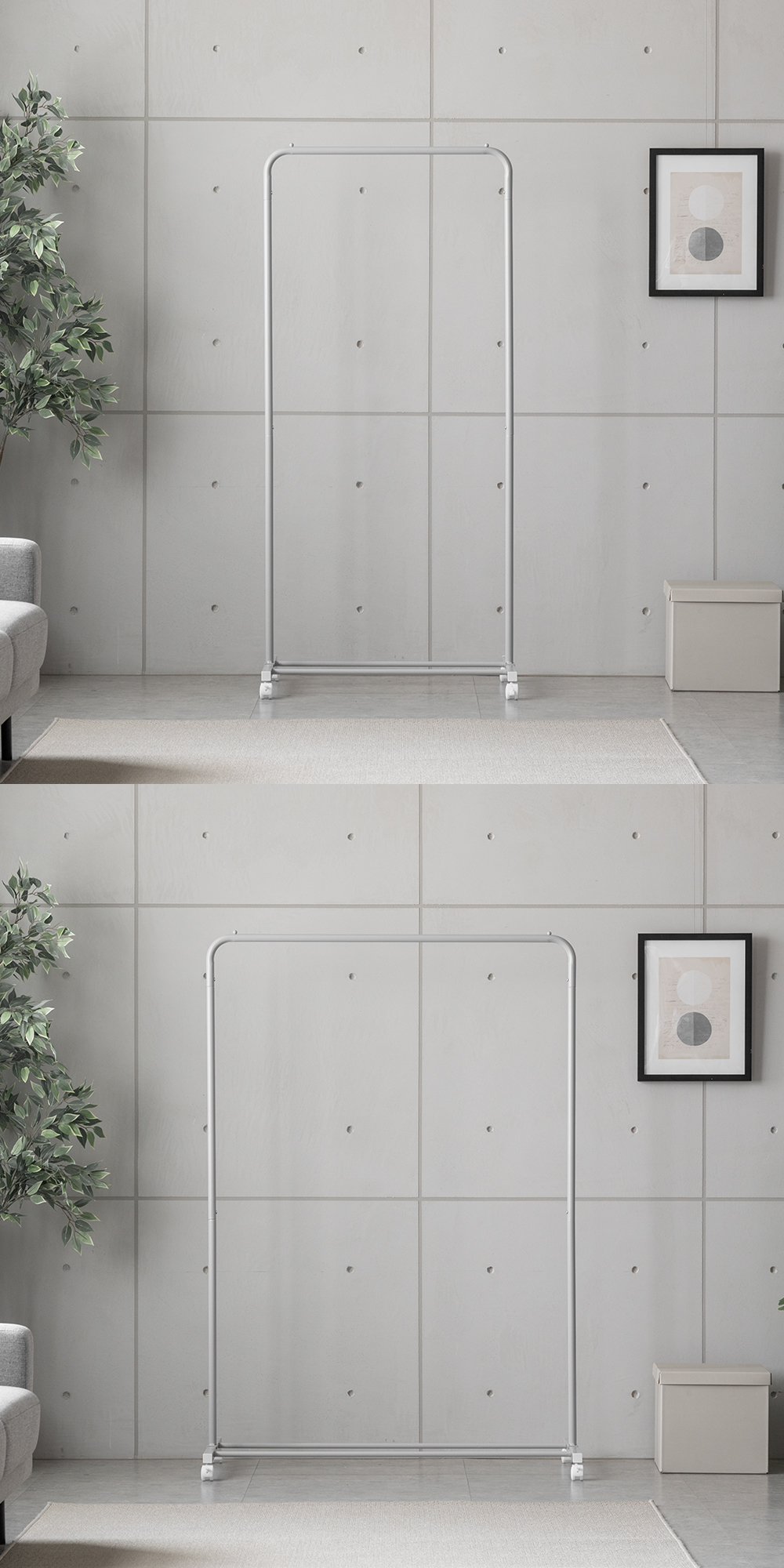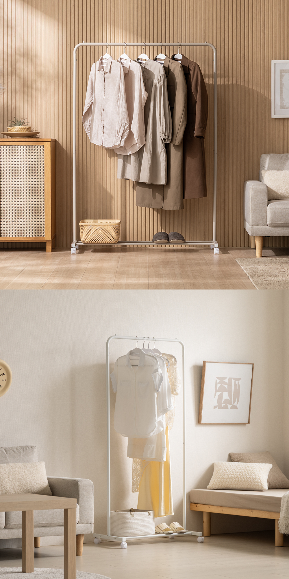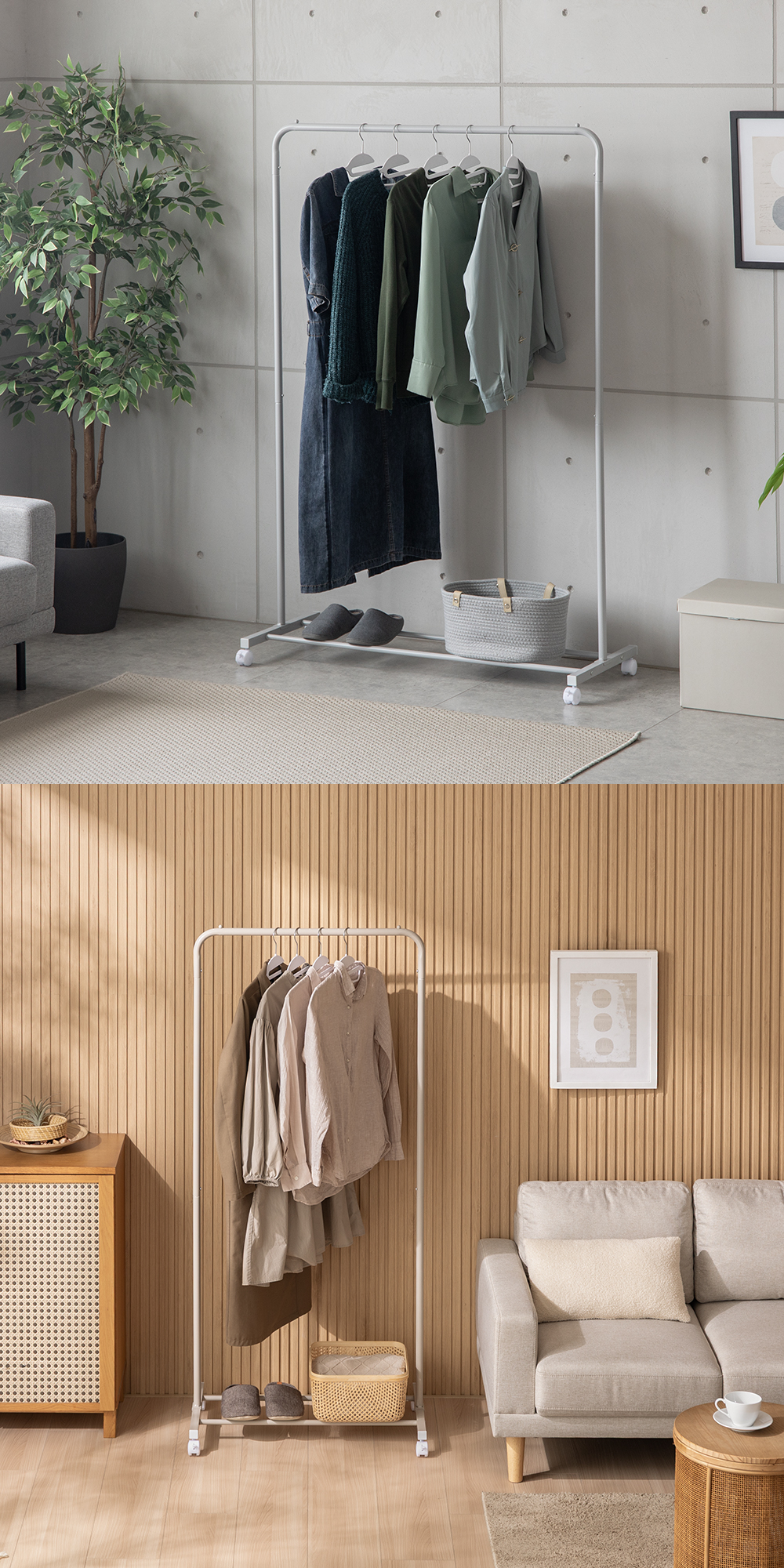 シンプル設計でインテリアに自然と溶け込むハンガーラック。収納力と使いやすさも兼ね備え、生活感を抑えながら空間を整えます。