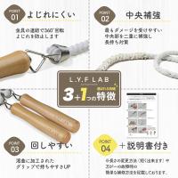 木製グリップを曲線加工することにより「 持ちやすく滑りにくい 」構造となっております。また、ロープならではの適度な重みに加え、木製グリップと縄の接続を360°自在に回転する金具で接続することにより「 ねじれ防止 」と回し手の「 負担を軽減 」する構造となっております。