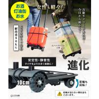 灯油缶、お水やお酒のまとめ買い、クーラーボックス、雑誌や新聞の処分に!日常のちょっとした重い荷物をキャリーカートで軽々移動!走行時の安定性・静音性をより強化した直径10cmのタイヤが、快適な引き心地を実現。丈夫で太いスチールボールを採用したことで、細いスチールポール製に多かった曲がりや折れによる故障等を低減!また当商品は前輪も含め4つの全てのタイヤが回転するタイプのキャリーカートとなり、玄関や車のトランクからの積み下ろしの際に必要な小さな移動も楽チンでスムーズに。収納時は45×25×11cm、邪魔にならずちょっとしたスペースにスッと収まります。重量は約2kgと女性でも家から車への毎回の持ち運びも楽チンに!