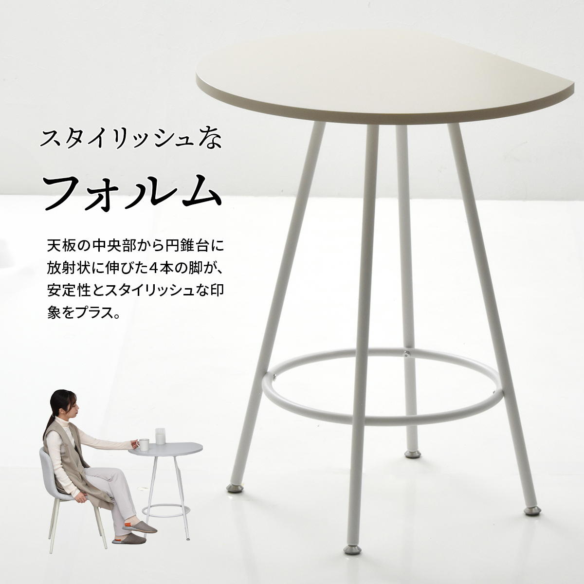 空間に柔らかみを与える円形天板の一部をカットする事で、壁付け設置を可能にし、省スペースを実現したカフェテーブルです。天板の中央部から放射上に伸びた4本の脚は安定性とスタイリッシュな印象をプラスします。天板は傷や水汚れに強いメラミン樹脂加工を施しておりますので、カフェテーブルとしての使用以外にも一人用のダイニングテーブルやパソコン作業スペースとしても安心してご使用頂けます。カラーはベージュ、ライトグレー、ダークグレーの3色をご用意しておりますので、お部屋のテイストに合わせてお選び頂けます。お家でホッと一息カフェ気分…そんな贅沢な時間のお供に如何でしょうか?.